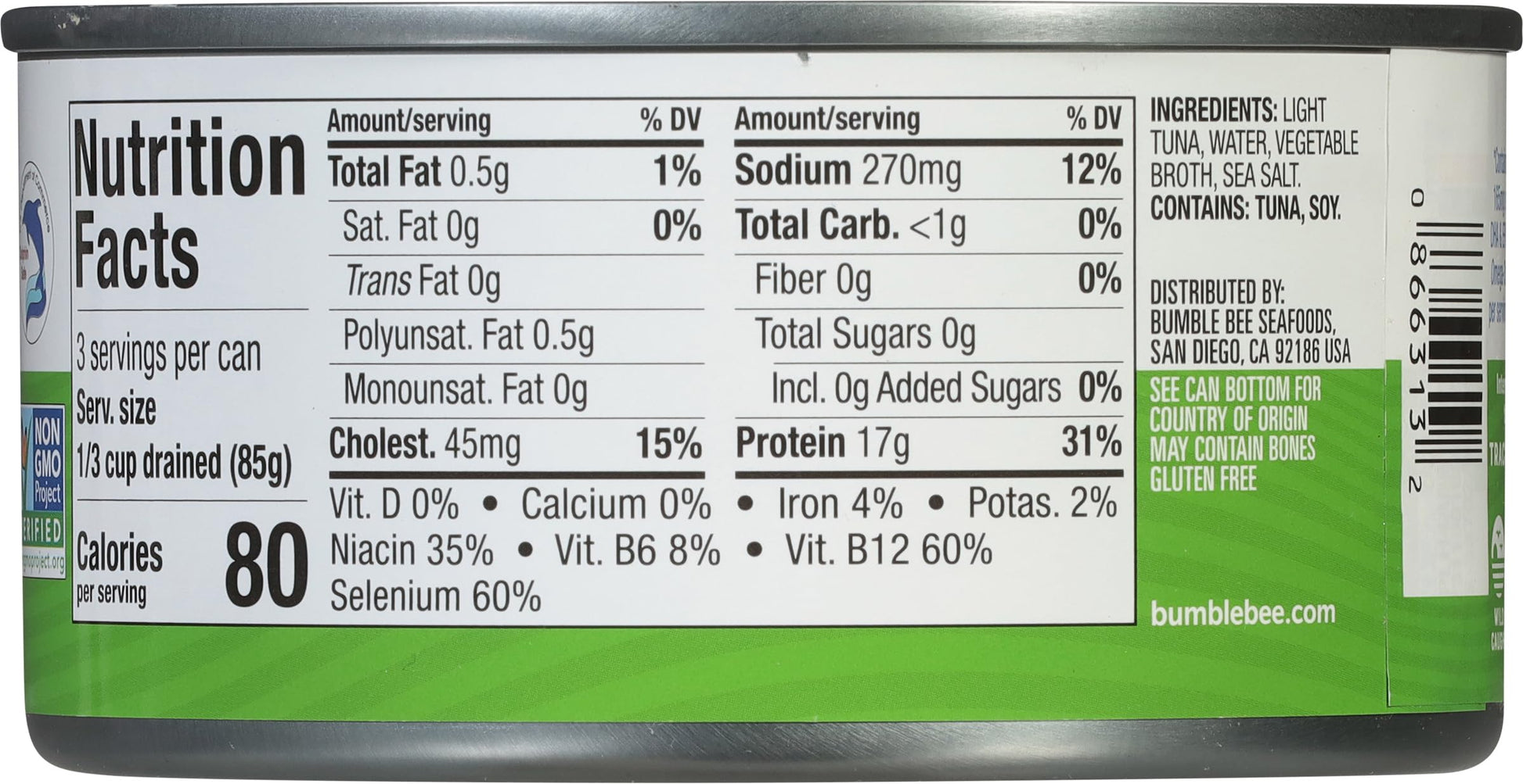 - Q: Is Bumble Bee Chunk Light Tuna safe for those with dietary restrictions? A: Yes, this product is Non-GMO Project Verified, gluten-free, and kosher, making it suitable for individuals with gluten intolerance or those following a kosher diet. Always check the packaging for the most up-to-date information on allergens.