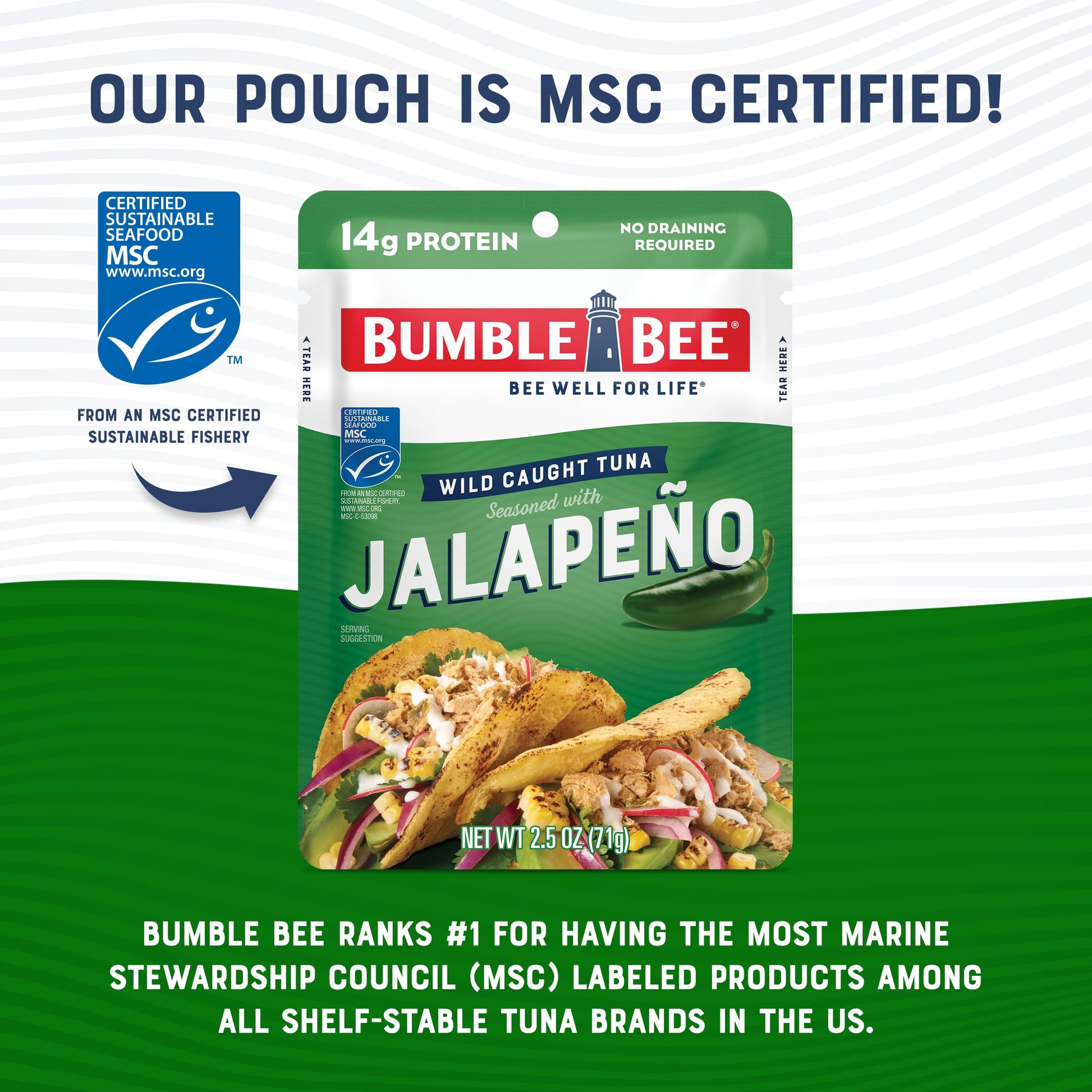 Q: How much protein does each pouch contain?A: Each 2.5 oz pouch of Bumble Bee Jalapeño Seasoned Tuna contains 14 grams of protein, making it a healthy and protein-packed snack or meal choice.