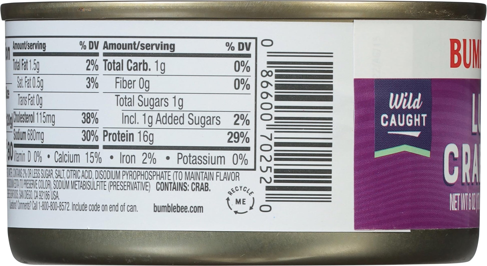 Q: What is the packaging size of Bumble Bee Lump Crab Meat?A: Bumble Bee Lump Crab Meat comes in a 6 oz can, and each pack contains 12 cans, making it convenient for bulk purchases and easy storage.