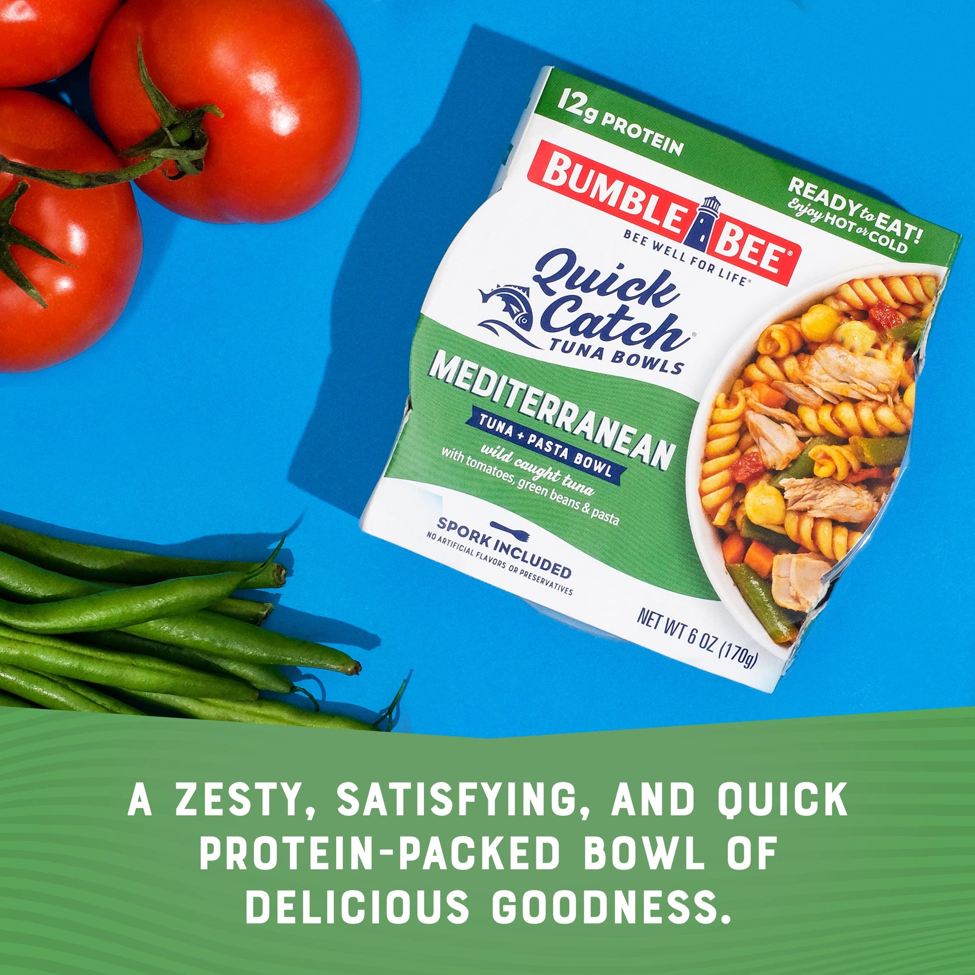 Q: What is included in the Bumble Bee Quick Catch Mediterranean Pasta Bowl?A: The Bumble Bee Quick Catch Mediterranean Pasta Bowl includes wild caught tuna, Mediterranean inspired spices, tomatoes, green beans, and pasta, creating a flavorful and satisfying meal.