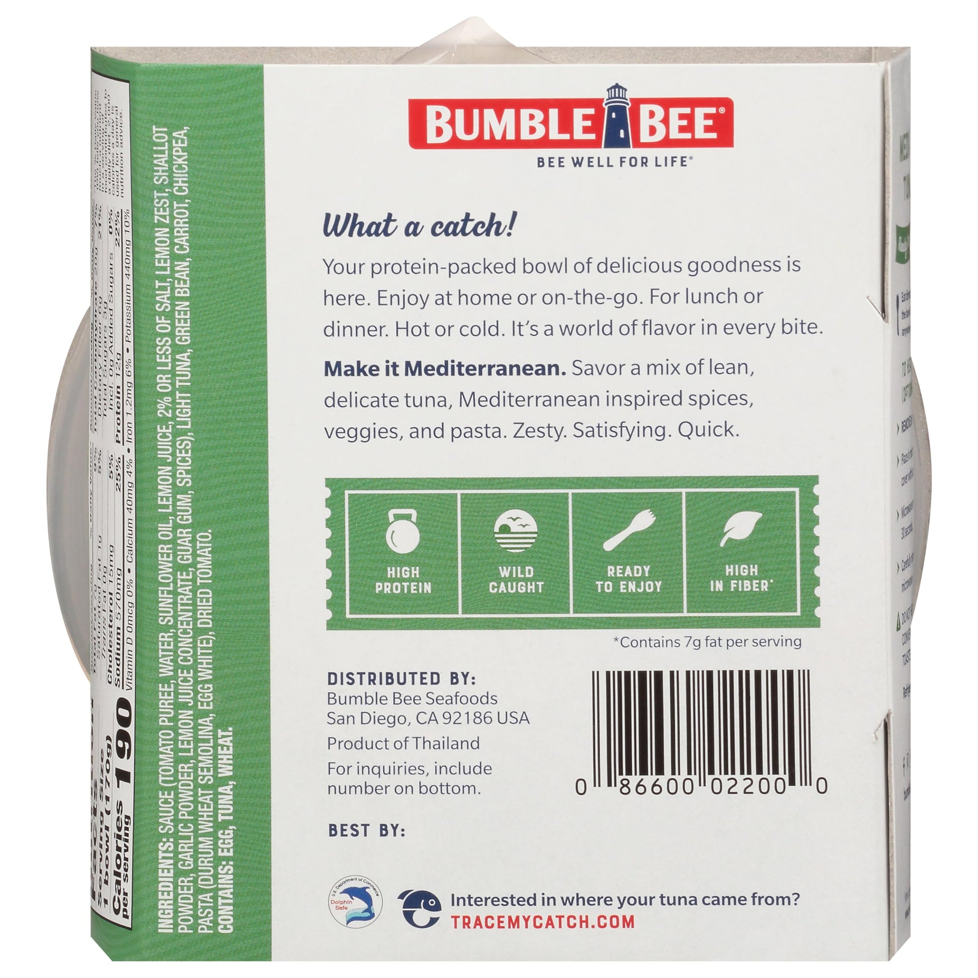Savor a mix of lean, delicate Bumble Bee tuna, Mediterranean inspired spices, veggies, and pasta. Zesty. Satisfying. Quick. Your protein-packed bowl of delicious goodness is here. Enjoy at home or on-the-go. For lunch or dinner. Hot or cold. Bumble Bee Quick Catch Mediterranean Pasta Tuna and Pasta Bowl offers a world of flavor in every bite.