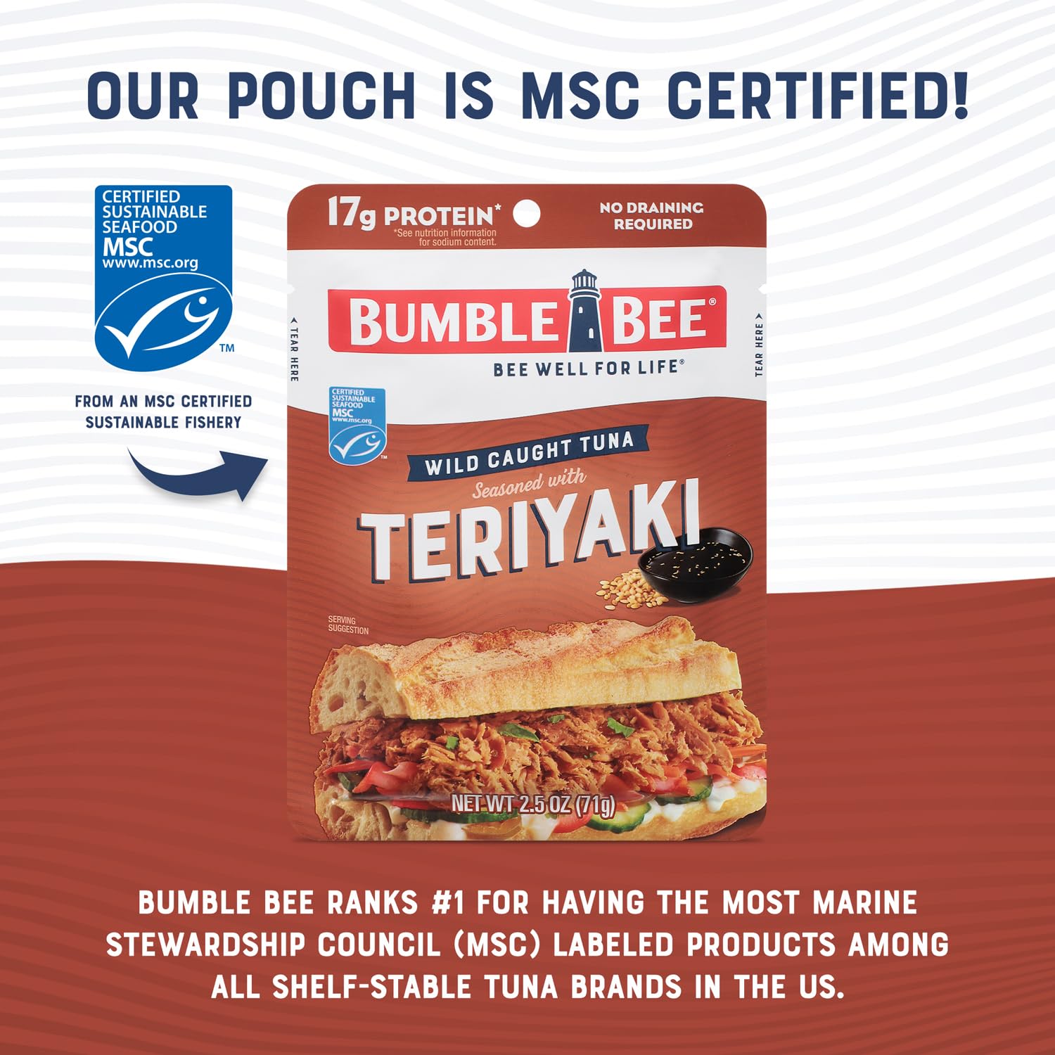 Q: Is the tuna sustainably sourced?A: Yes, Bumble Bee Teriyaki Seasoned Tuna is MSC Certified Sustainable Seafood, ensuring that the tuna is wild caught and dolphin safe, promoting responsible fishing practices.