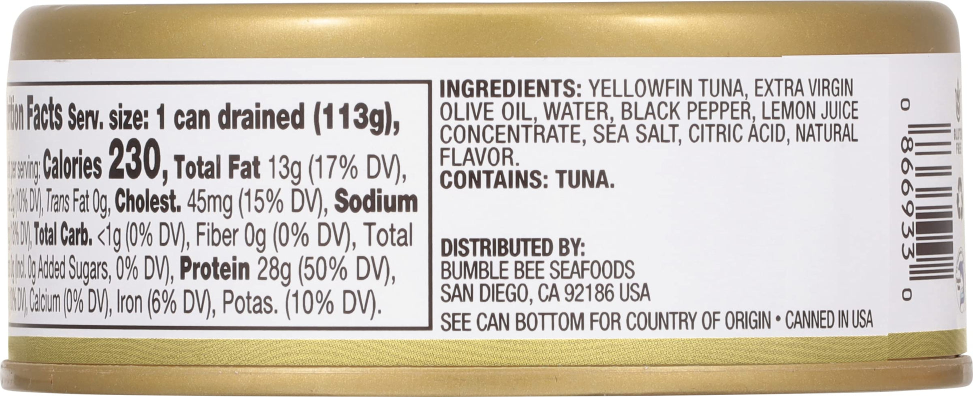- Q: What are the main ingredients in Bumble Bee Prime Lemon & Pepper Yellowfin Tuna? A: The main ingredients include premium yellowfin tuna, extra virgin olive oil, lemon, and pepper. This combination creates a flavorful and sophisticated canned tuna product.