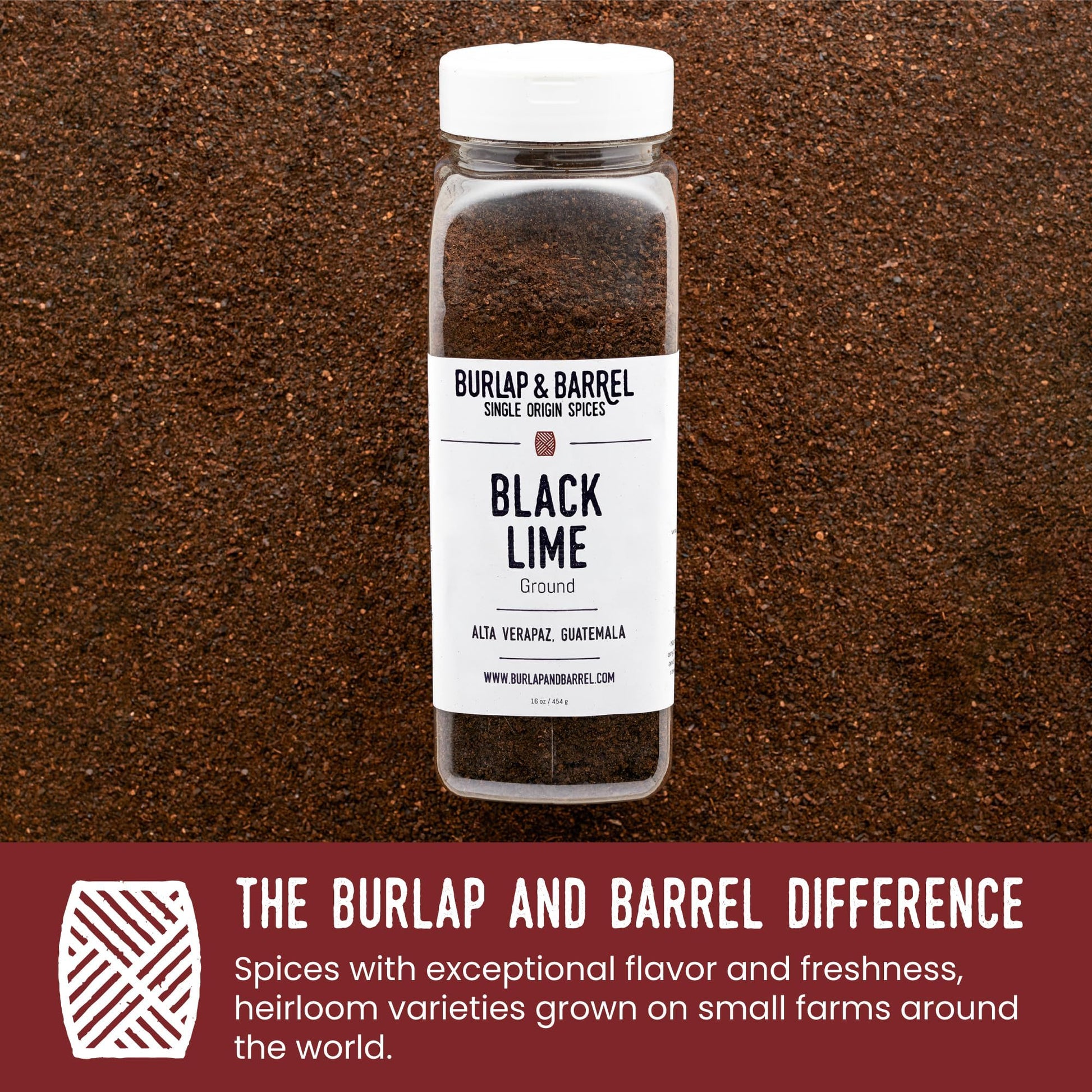 - Q: What makes Burlap & Barrel Ground Black Lime different from regular lime? A: Unlike regular lime, which is typically fresh or juiced, Burlap & Barrel Ground Black Lime is made from ripe limes that are dried in the sun until they oxidize into a black, savory spice. This process intensifies its flavor, making it tart and complex.