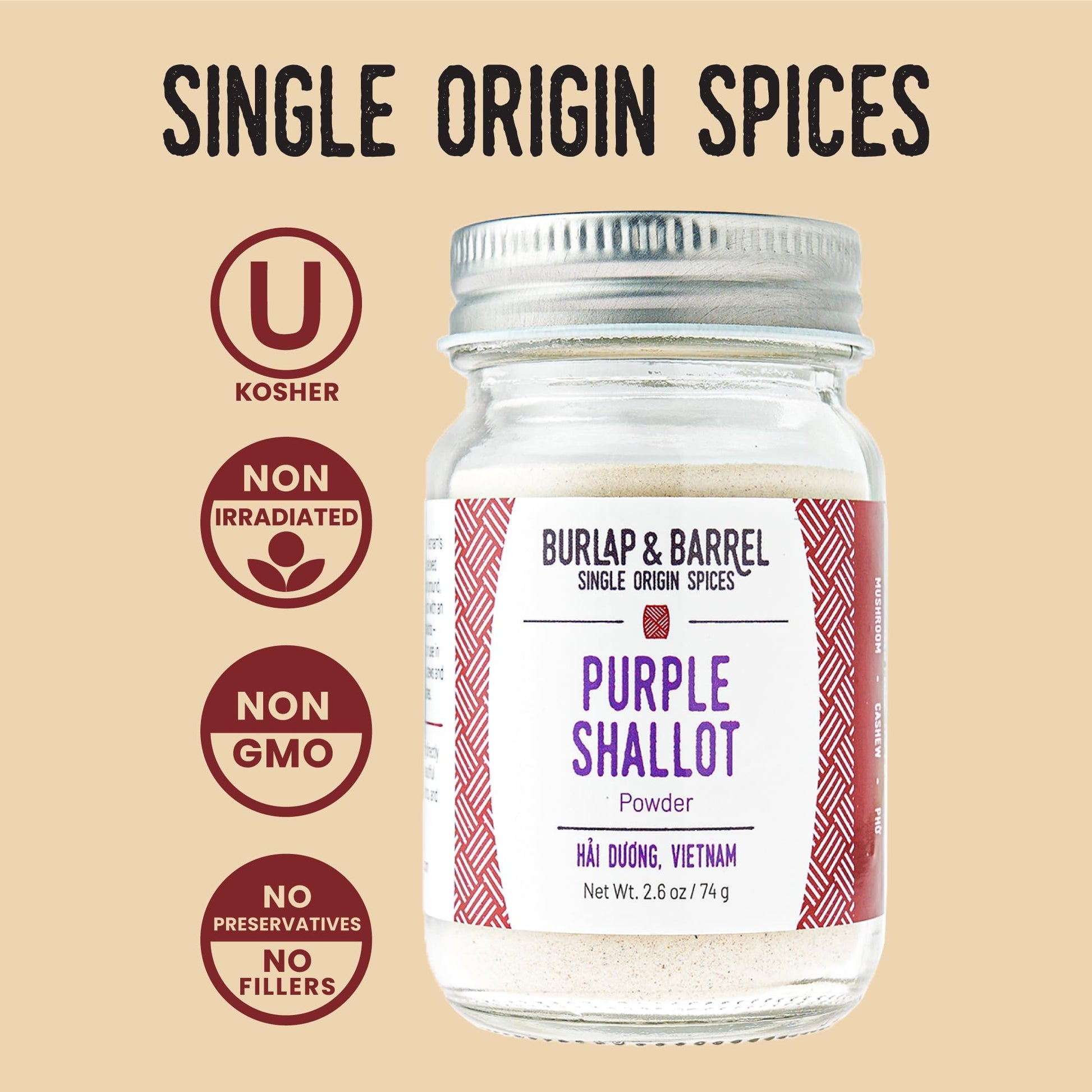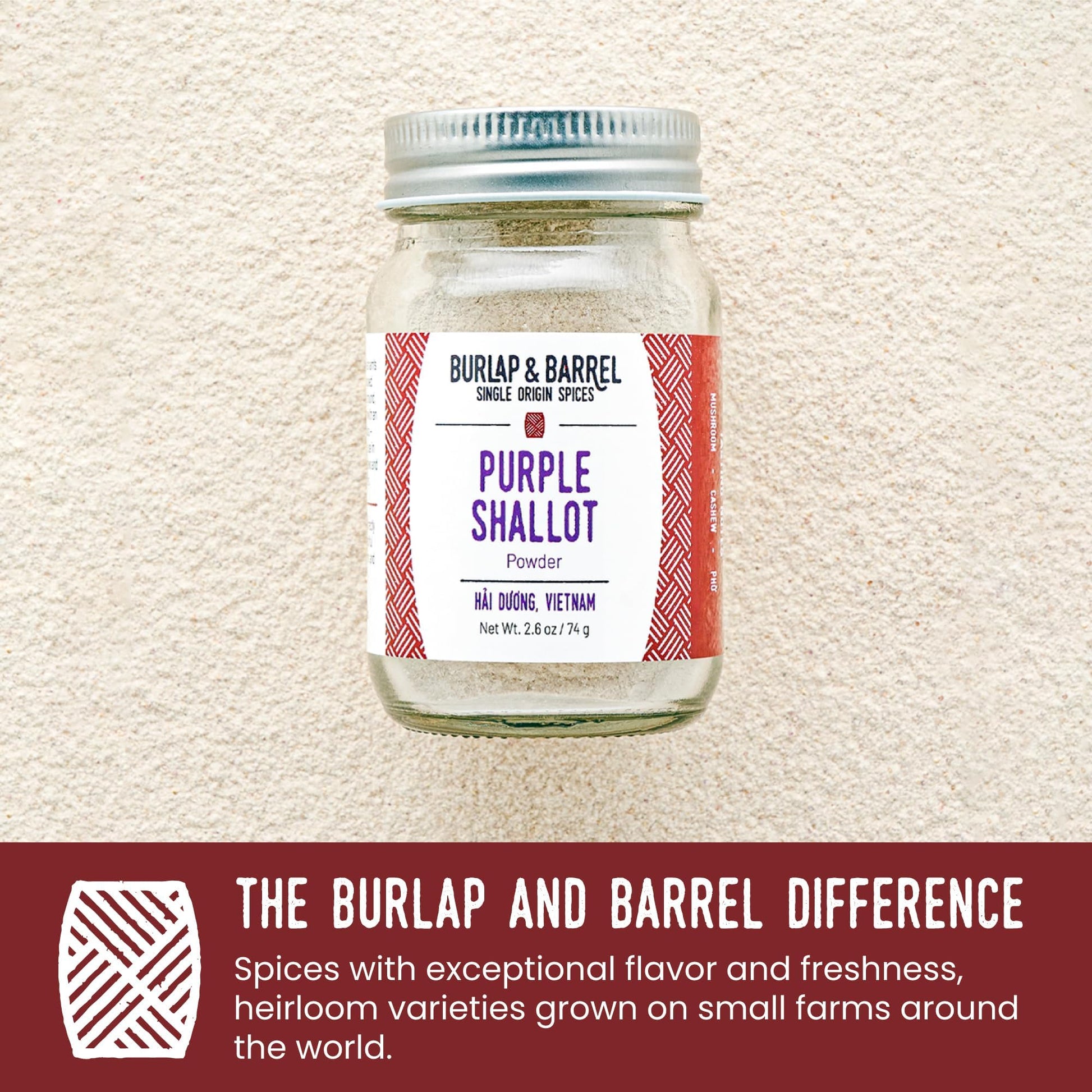 - Q: What is Burlap & Barrel Purple Shallot Powder made from? A: Burlap & Barrel Purple Shallot Powder is made from air-dried purple shallots, sourced directly from small farms in Vietnam's Red River Delta.