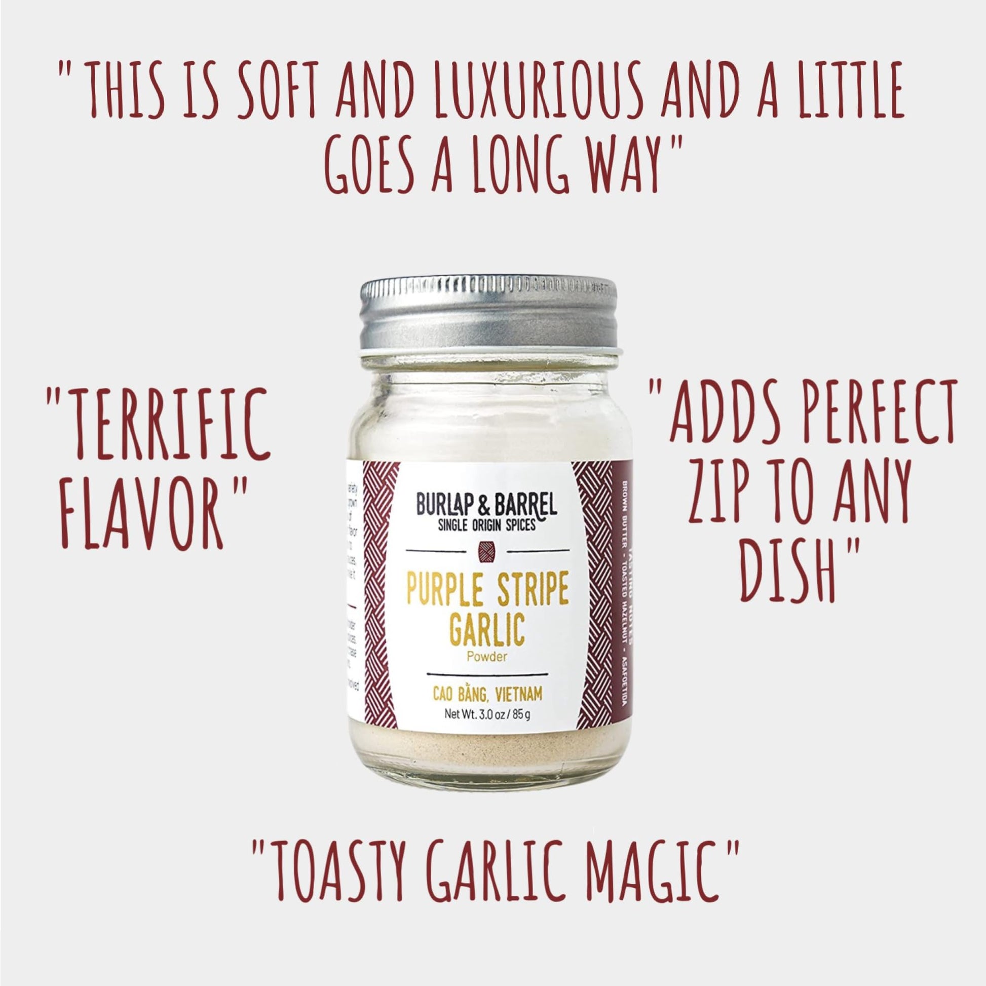 - Q: What is Burlap & Barrel Purple Stripe Garlic Powder? A: Burlap & Barrel Purple Stripe Garlic Powder is a spice derived from an heirloom Vietnamese garlic variety known for its unique purple stripe. It offers a savory and sweet flavor profile, making it an excellent alternative to fresh or granulated garlic.
