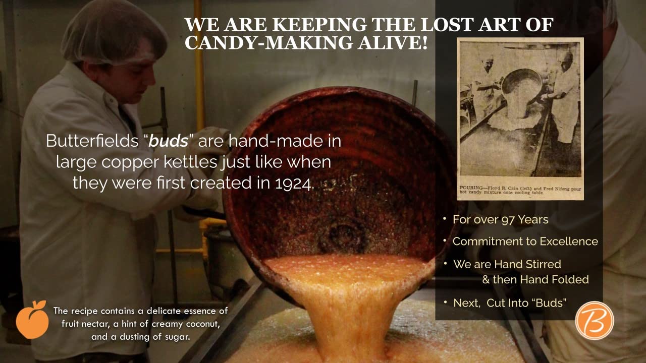 - Q: What makes Butterfields Candy different from other hard candies? A: Butterfields Candy distinguishes itself by using classic recipes to create unique, gem-like shapes and textures, all while focusing on high-quality ingredients and traditional craftsmanship.