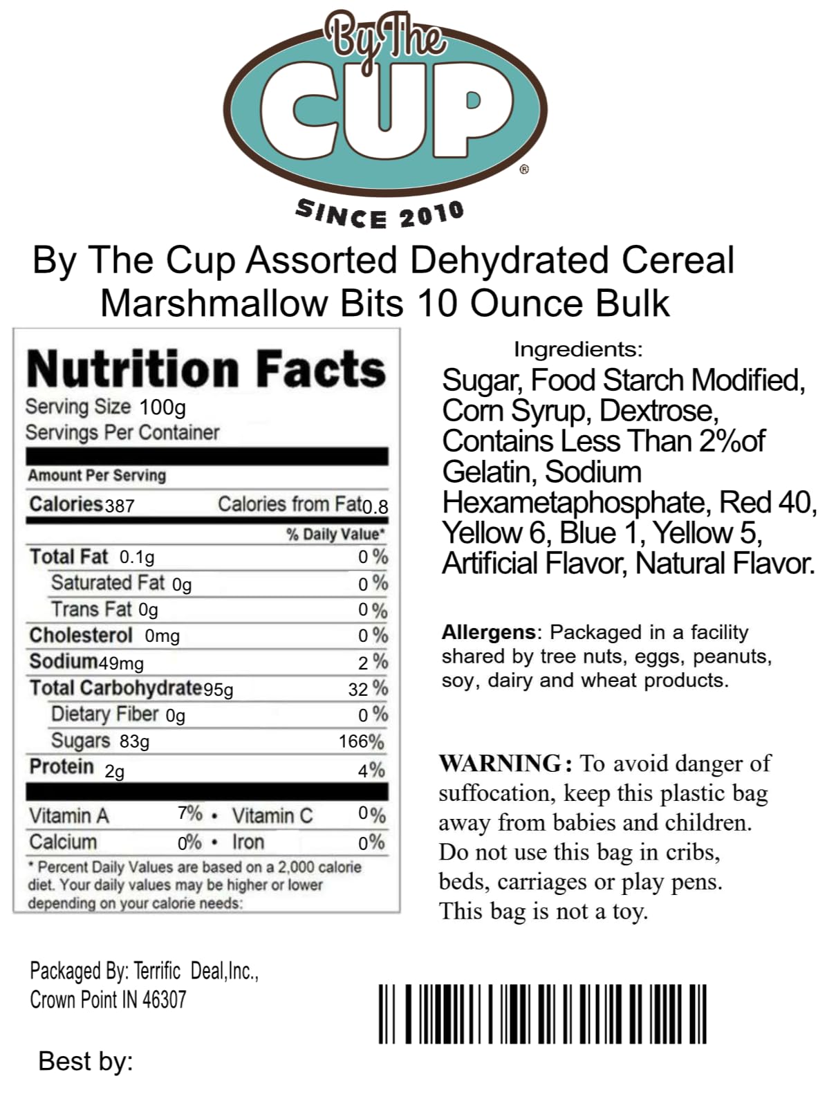 Q: What are the By The Cup Assorted Dehydrated Cereal Marshmallow Bits made of?A: These marshmallow bits are made from sweet and colorful dehydrated marshmallows, similar to those found in popular cereals, ensuring a delightful addition to your snacks and desserts.