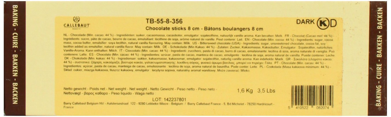 Q: What are Cacao Barry 44% Dark Chocolate Sticks best used for?A: Cacao Barry 44% Dark Chocolate Sticks are ideal for baking, snacking, and decorating desserts. They are perfect for making chocolate croissants (pain au chocolat), cookies, and can be stirred into hot beverages like coffee or cocoa.