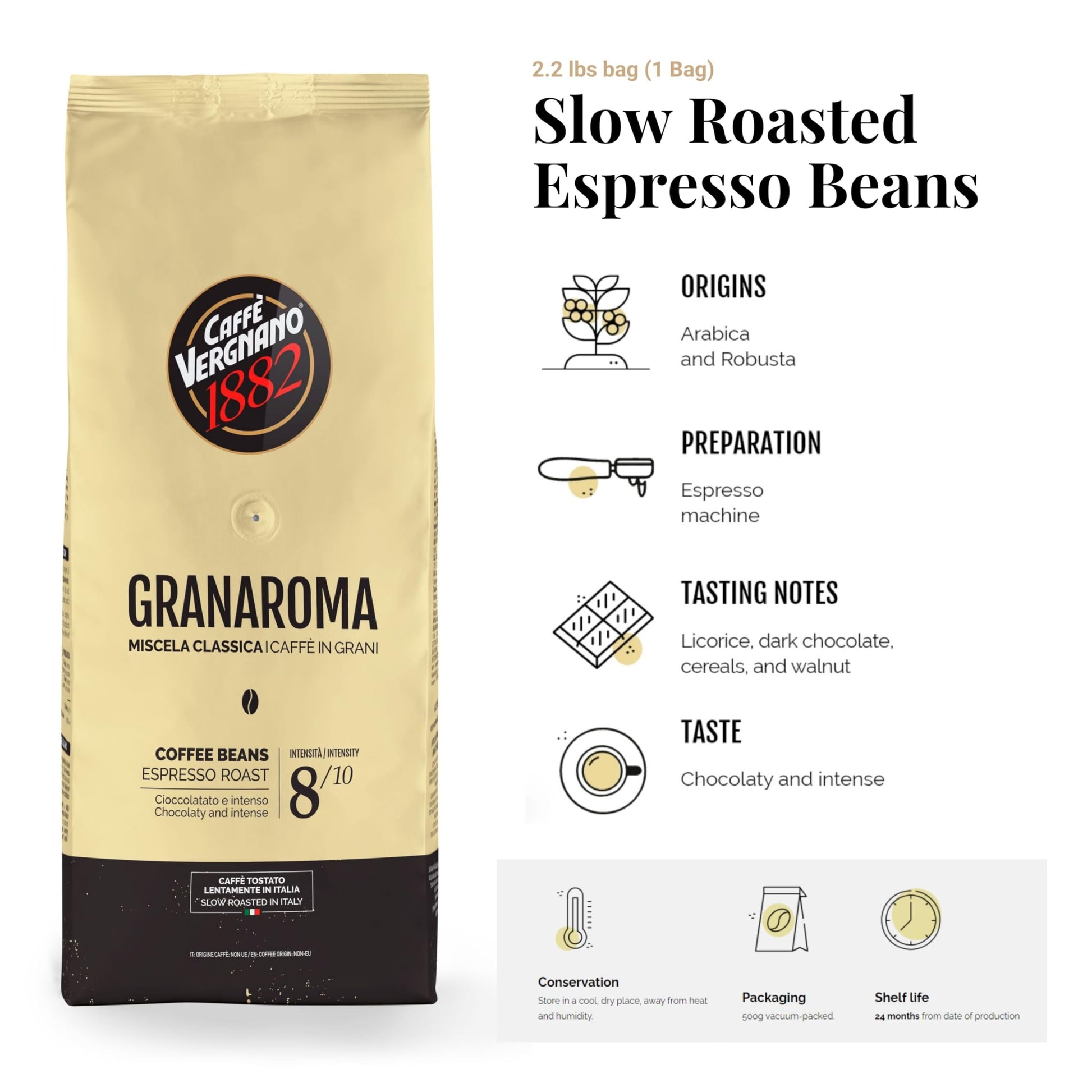 Caffe Vergnano 1882 Gran Aroma Whole Bean Arabica Medium Espresso Roast Coffee, 2.2Lbs Bag - Italian Coffee Beans With Rich Note