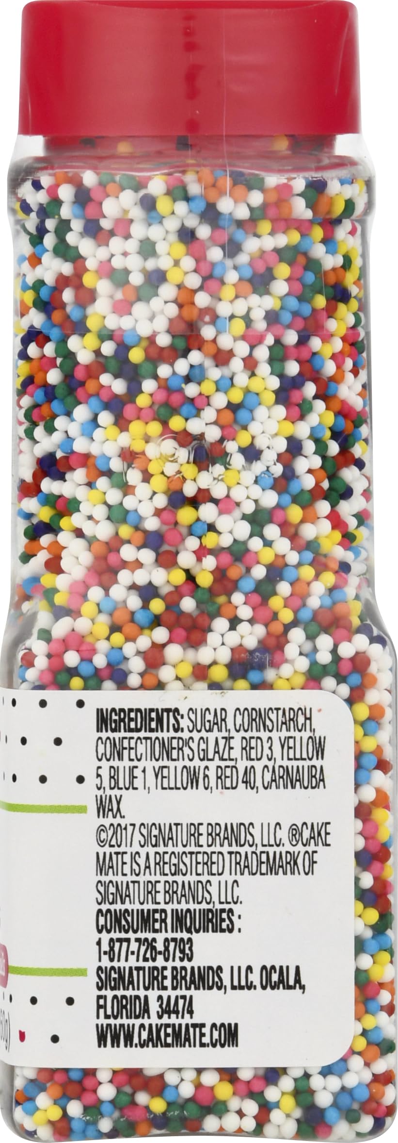 Q: What are Cake Mate Nonpareils Sprinkles made of?A: Cake Mate Nonpareils Sprinkles are made from edible ingredients that provide a colorful and fun decoration for your desserts, including sugar and food coloring.
