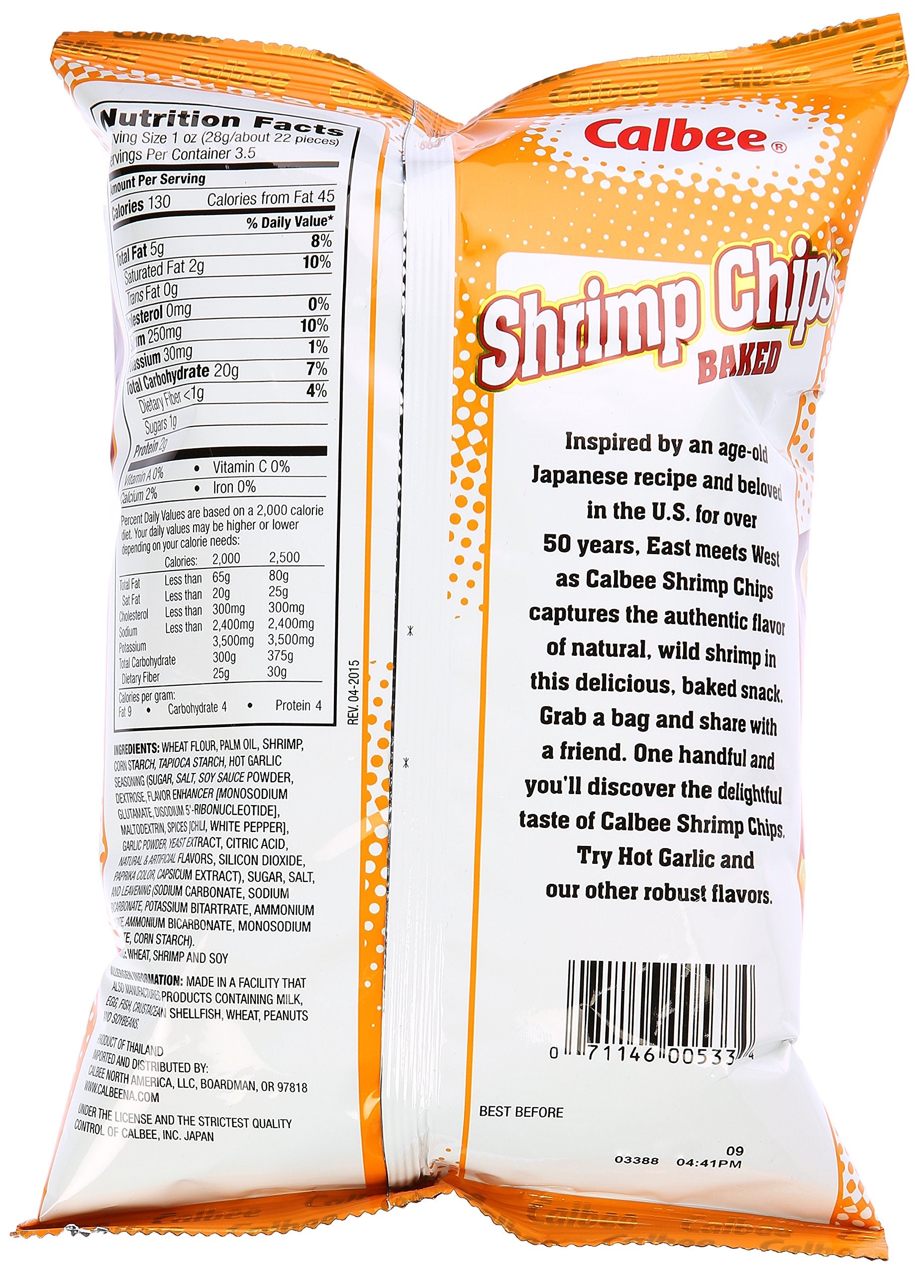 Shrimp Chips are a classic Asian snack. These are given a little kick with the new hot garlic flavor. INGREDIENTS: Wheat flour, Canola oil, Modified food starch, Shrimp, Sugar, Baking powder, Soy sauce powder, Salt, Yeast extract, MSG, Maltose, Natural flavor, Spices, Licorice, 5' Ribonucleotide, Disodium succinate, Citric acid, Paprika color, Silicon Dioxide.