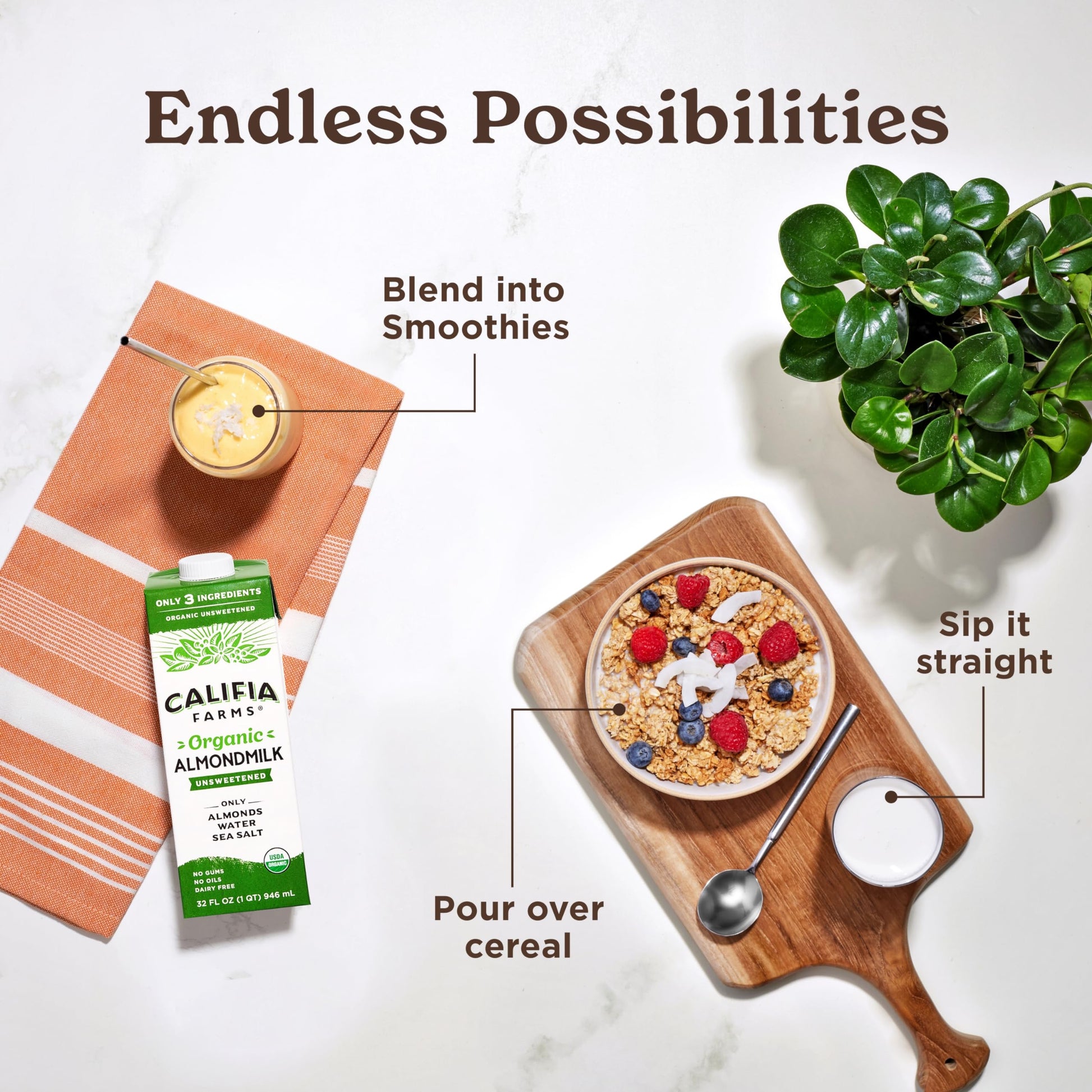 Califia Farms - Organic Unsweetened Almond Milk, 32 Oz (Pack of 6), Dairy Free, Vegan, Plant Based, Keto, Vegan, Gluten Free, No
