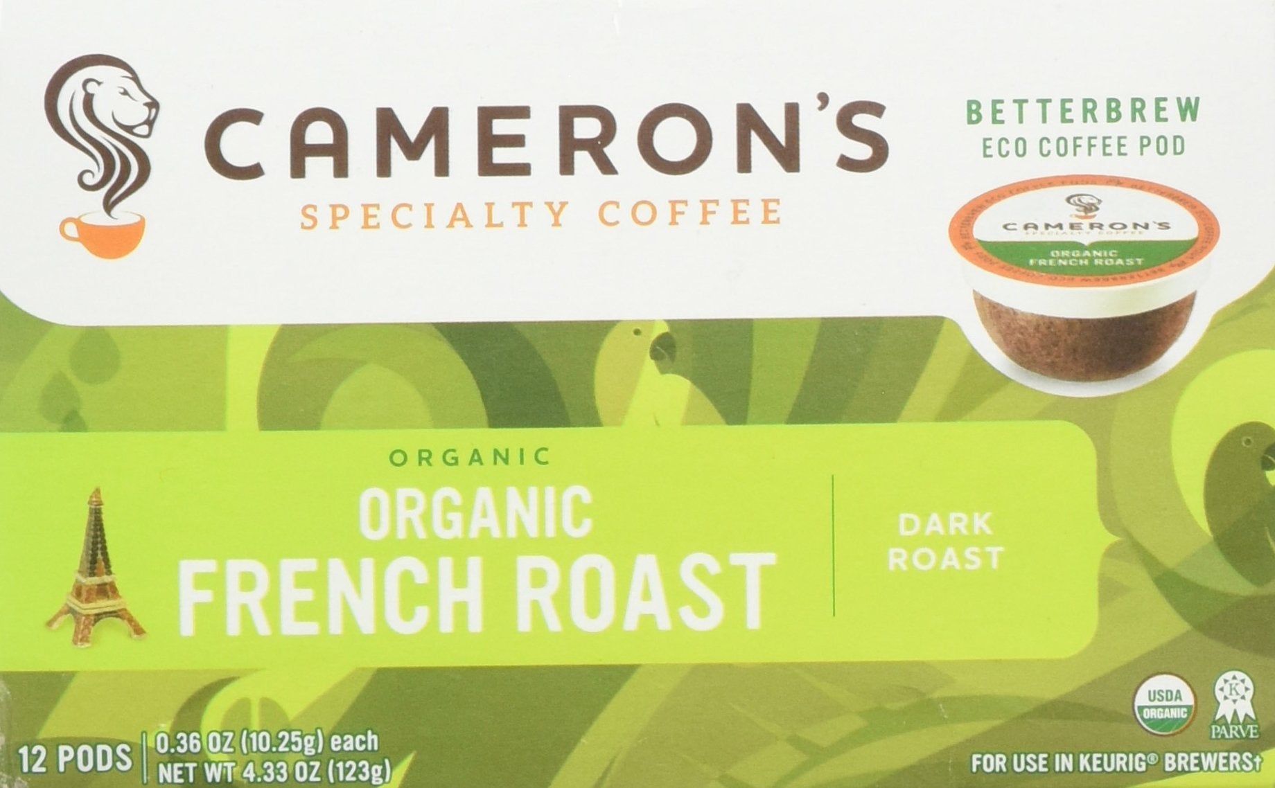 Q: What are the key features of Cameron’s Organic French Roast Coffee?A: Cameron’s Organic French Roast Coffee is made from 100% organic arabica beans and features a dark roast flavor. The coffee pods are single-serve, packaged in biodegradable materials, making them eco-friendly.