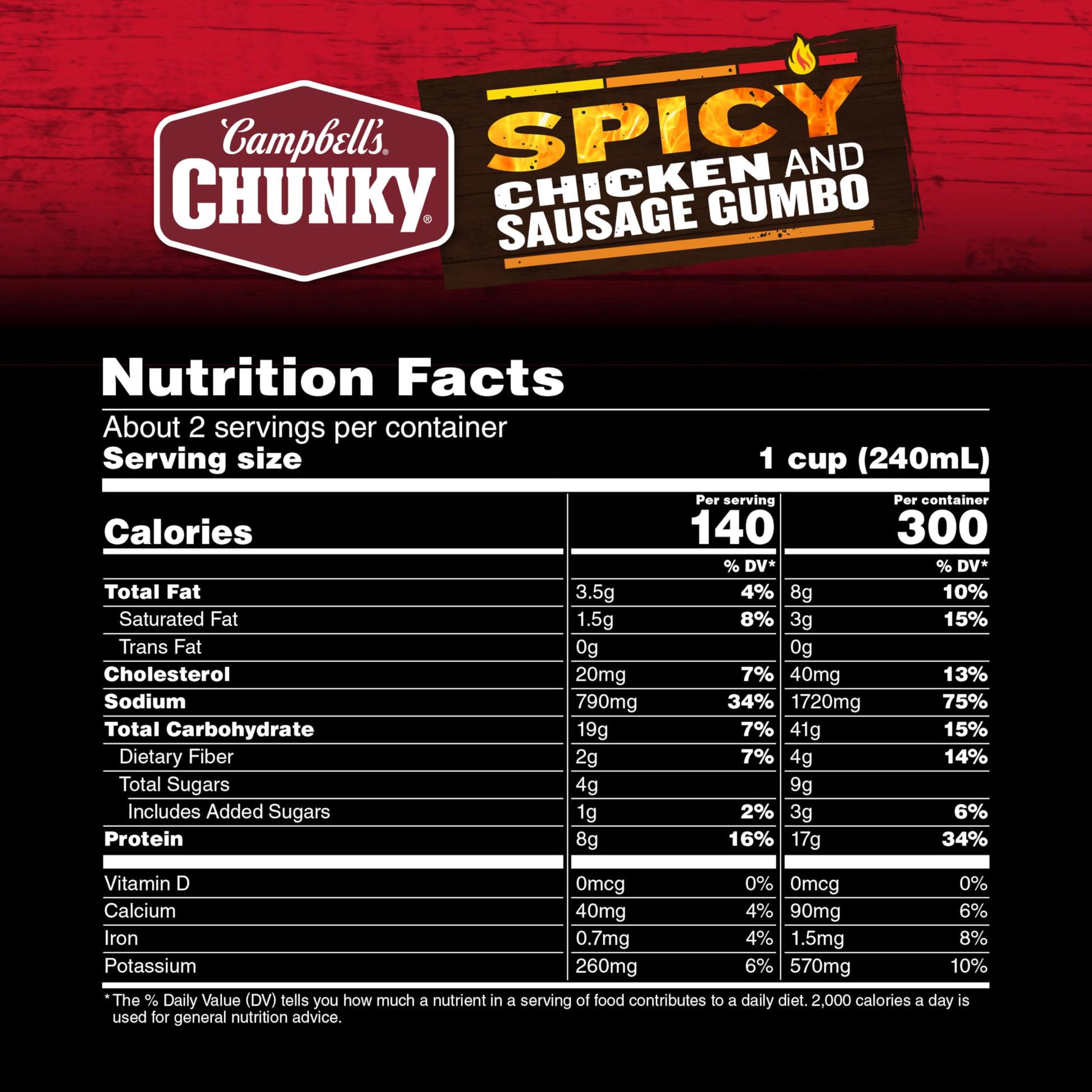 Campbell’s Chunky Spicy Chicken and Sausage Gumbo isn’t just tasty—it's made to spice up your life. With mouth-watering, sizzling flavors and bold ingredients, this soup is capable of fueling even the heartiest appetite. A spicy spin on classic comfort food, this sausage and chicken soup is bursting with flavor from hearty pieces of chicken meat with no antibiotics, Andouille sausage, okra and peppers in a cayenne pepper sauce seasoned with vibrant spices. Each can has 17 grams of protein. It Fills You Up Right. Just pop this spicy soup into a saucepan or microwave-safe bowl, heat and enjoy. Whether you’re looking for quick and easy microwave soups for home or something to take on the go, Campbell’s has you covered. The sausage and chicken soup can is recyclable for easy disposal. Take on the great outdoors with Campbell’s Chunky Spicy Chicken and Sausage Gumbo—Soup That Eats Like a Meal. In addition to Spicy Chicken and Sausage Gumbo, Campbell's Chunky Soup is also available in other hearty varieties, like Classic Chicken Noodle, Spicy Sirloin Burger Soup and more.