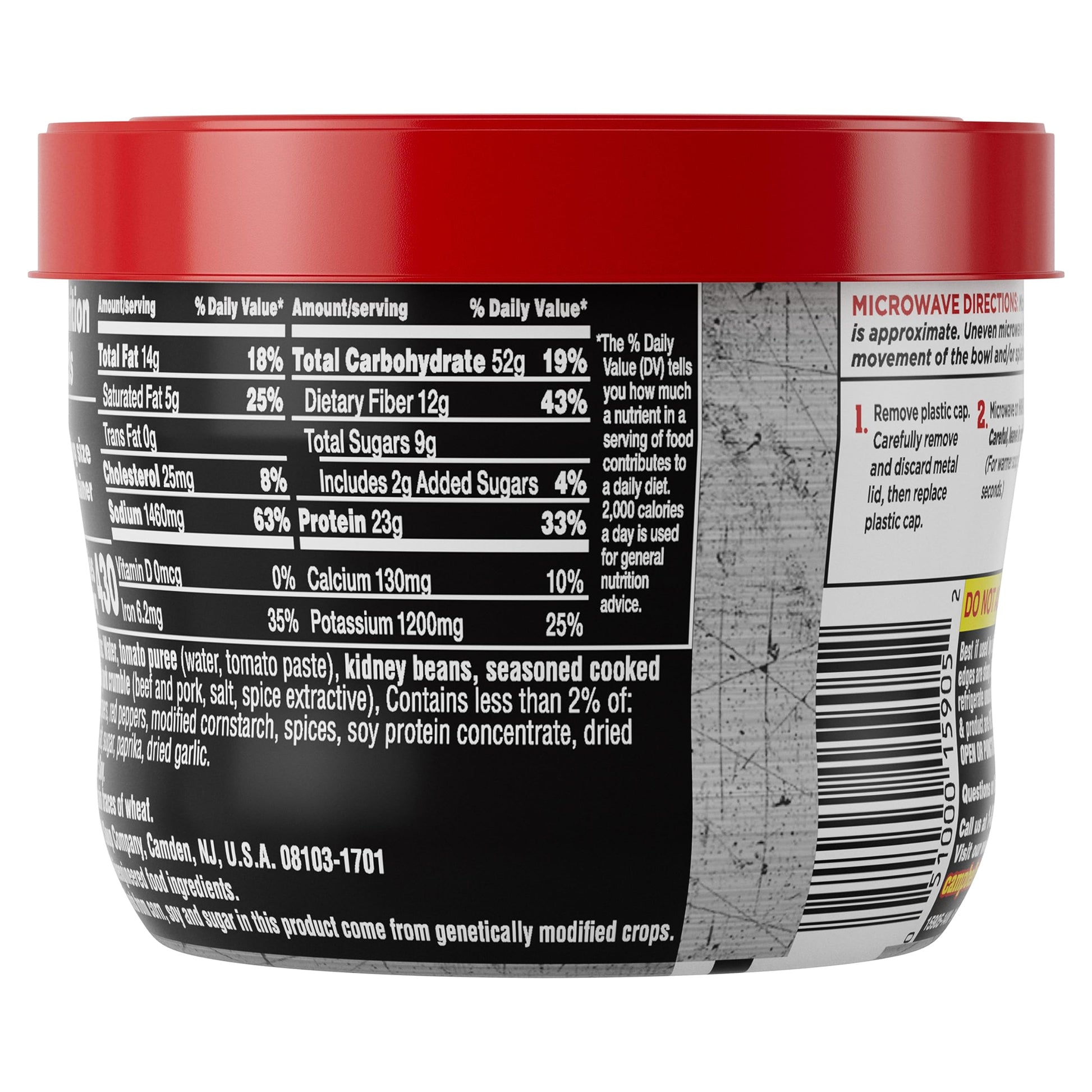 Campbells Chunky Hot & Spicy Chili with Beans isnt just tasty-it's made to work as hard as you do. With never-ending big flavors and bold ingredients, this fiery take on a comfort food classic is capable of fueling the heartiest appetite. This ready-to-eat spicy chili is crafted with hearty ingredients like kidney beans, seasoned beef and pork, red and green peppers, and spices in a delicious tomato puree. Each bowl has 23 grams of protein. Packaged in a convenient microwavable bowl, this hot chili requires no extra dishes to enjoy. Just open the instant chili bowl and pop in the microwave when you're hungry and crunched for time. Whether youre looking for quick and easy to microwave chili for home or something to take on the go, Campbells has you covered. Enjoy Campbells Chunky Hot & Spicy Chili with Beans. In addition to Hot & Spicy Chili with Beans, Campbell's Chunky Chili is also available in Chili with Beans.