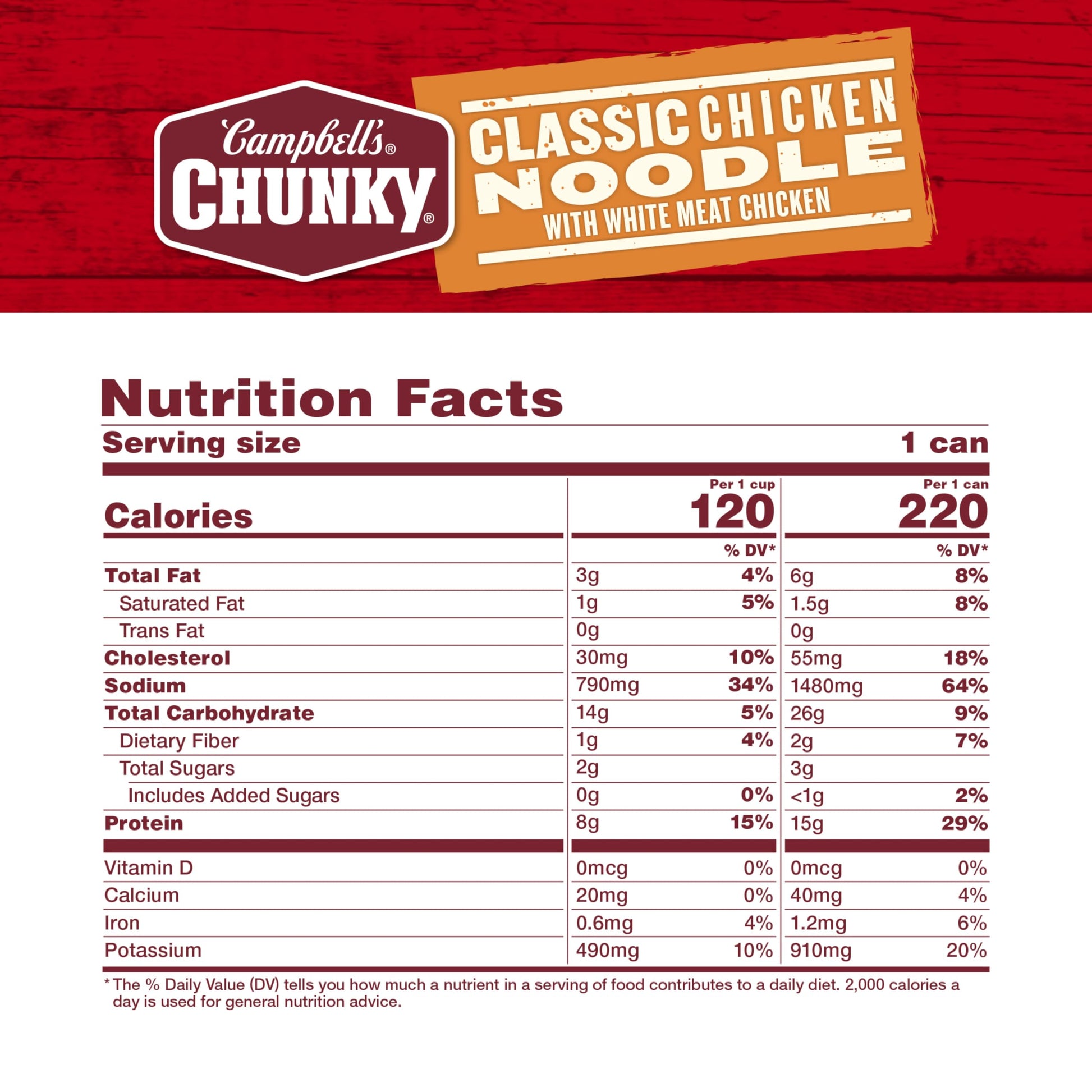 Campbells Chunky Classic Chicken Noodle Soup isnt just tasty-it's made to work as hard as you do. With never-ending big flavors and bold ingredients, this comfort food classic is capable of fueling even the heartiest appetite. This ready-to-eat chicken soup is crafted with big pieces of chicken meat with no antibiotics, chunks of carrots and celery, and enriched egg noodles. Each can has 15 grams of protein. It Fills You Up Right. Just pop this ready to serve soup in a microwave-safe bowl, heat and enjoy. Or, warm it over the campfire on your outdoor adventures. Whether youre looking for quick and easy to microwave soups for home or something to take on the go, Campbells has you covered. The soup can is recyclable for easy disposal. Take on the great outdoors with Campbells Chunky Classic Chicken Noodle Soup-Soup That Eats Like a Meal.