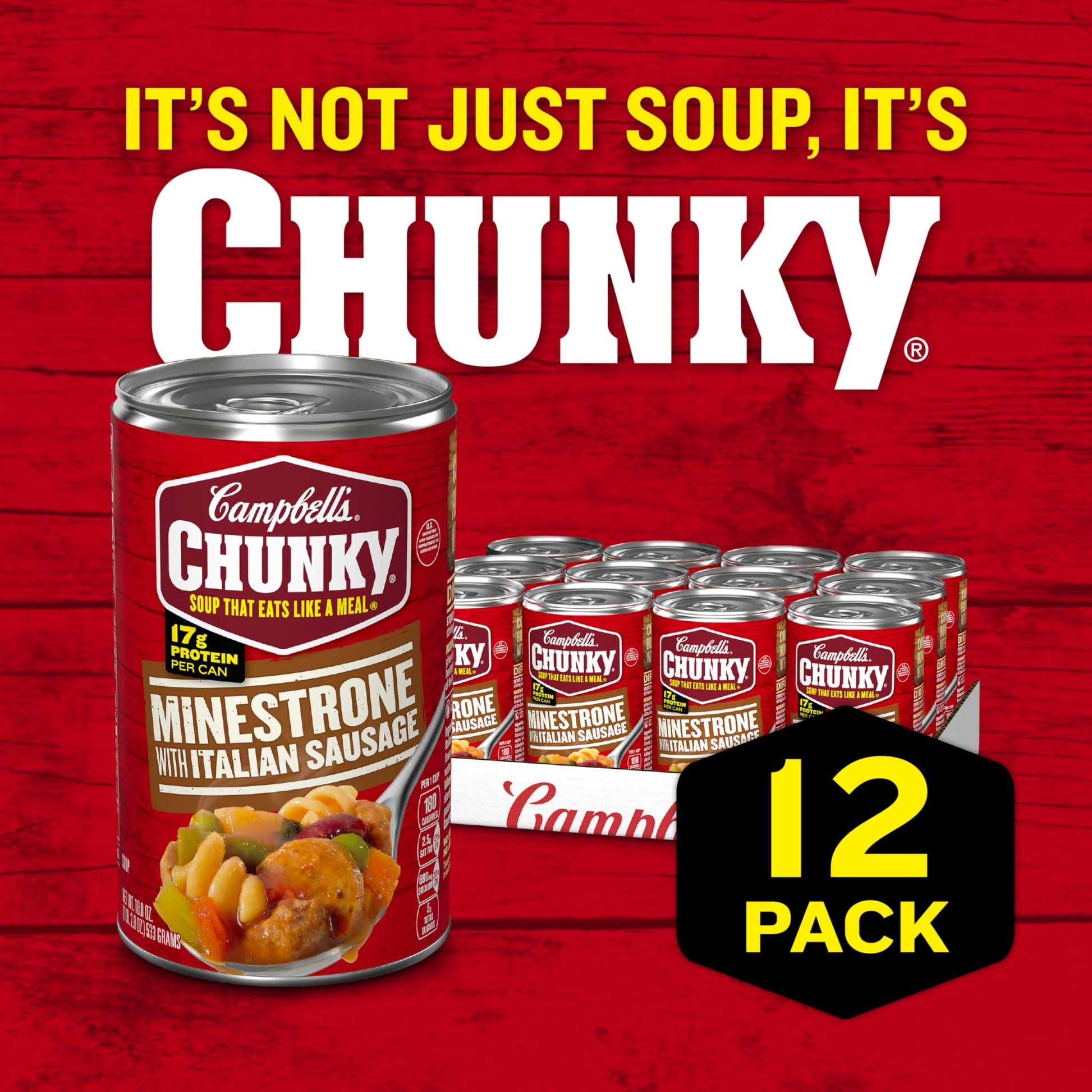 Campbell’s Chunky Minestrone with Italian Sausage Soup isn’t just tasty-it's made to work as hard as you do. With never-ending big flavors and bold ingredients, this canned soup is capable of fueling even the heartiest appetite. This ready-to-eat soup contains big, bold pieces of tomatoes, Italian sausage, potatoes, pasta and kidney beans. Each can has 17 grams of protein. It Fills You Up Right. Just pop this ready-to-serve soup in a microwave-safe bowl, heat and enjoy with your favorite sides. Or, warm it over the campfire on your outdoor adventures. Whether you’re looking for quick and easy to microwave soup for home or something to take on the go, Campbell’s has you covered. The soup can is recyclable for easy disposal. Take on the great outdoors with Campbell’s Chunky Minestrone With Italian Sausage Soup-Soup That Eats Like a Meal. In addition to Minestrone with Italian Sausage Soup, Campbell's Chunky Soup is also available in Beef and Barley, Sausage and Pepper Rigatoni, and more.