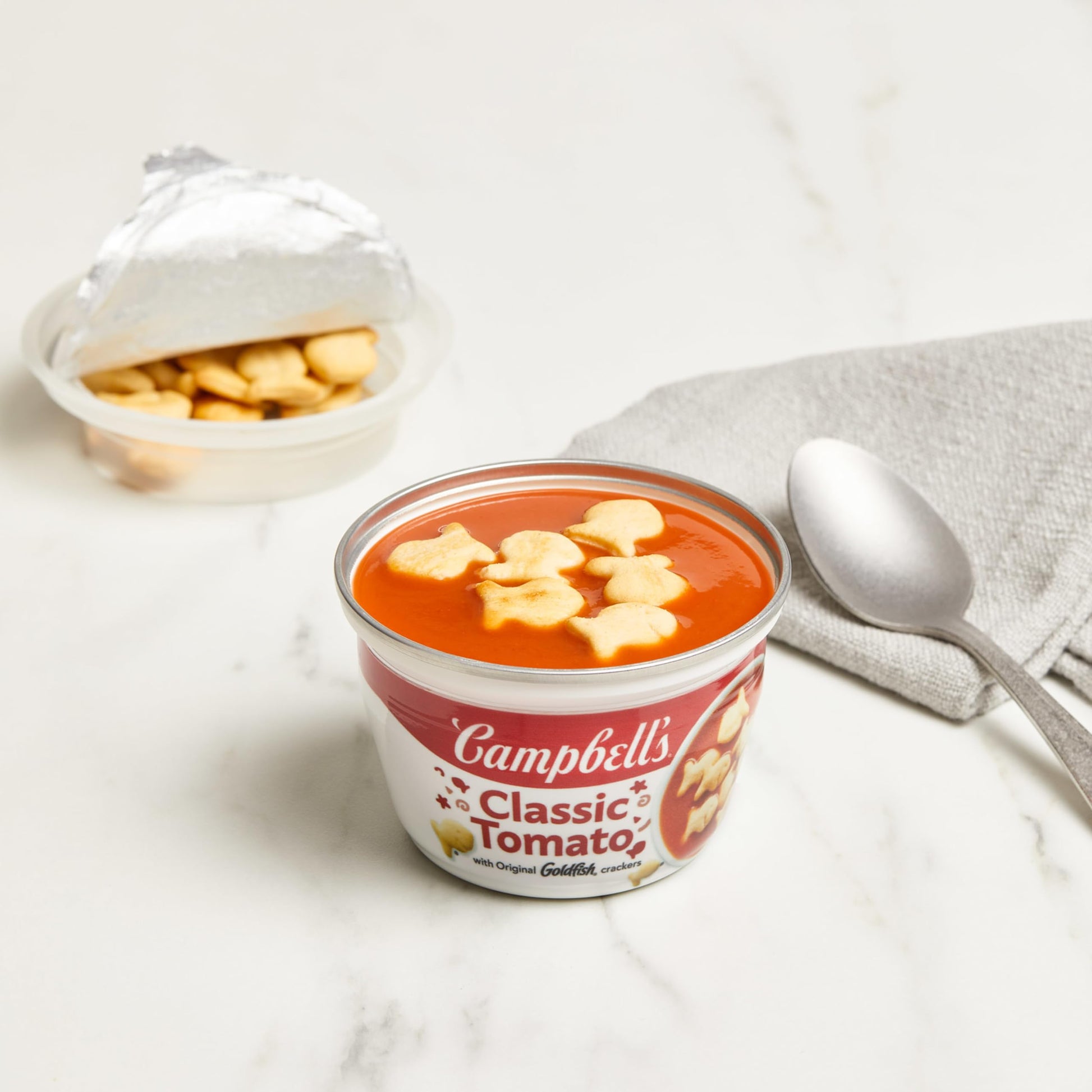 Q: What makes Campbell's Classic Tomato Soup different from other soups?A: Campbell's Classic Tomato Soup stands out due to its comforting flavor made with farm-grown tomatoes, paired with the satisfying crunch of Goldfish Crackers, creating a nostalgic and delightful eating experience.