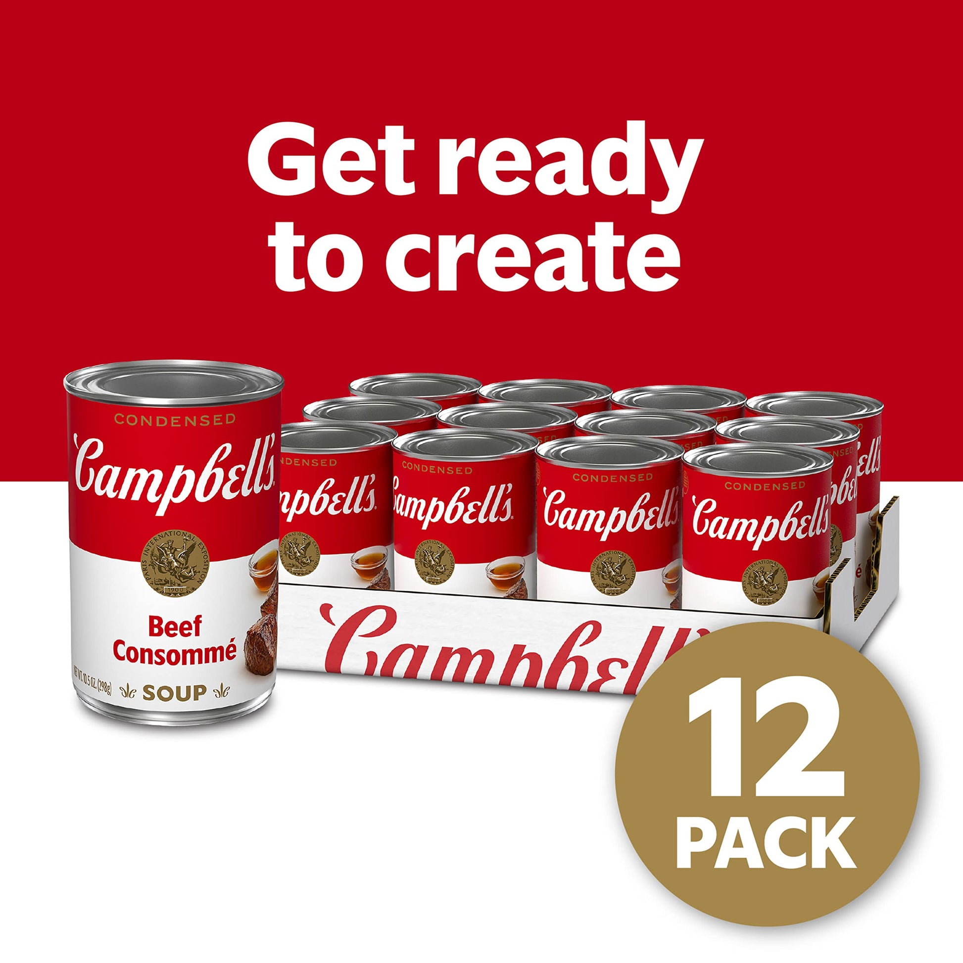 Campbells Condensed Beef Consomm is just the beginning of any great recipe. Join Campbells in cooking in the kitchen with this Condensed Beef Consomm that instantly imparts deep, savory, and rich flavor to any dish. This Beef Consomm is a rich and flavorful soup made from beef stock for an authentic flavor. It is perfect for creating family-friendly soups and other quick and easy recipes. Try it in your next Beef Birria Tacos or for a flavor-packed Southwest Skillet. With high-quality ingredients, Campbells Condensed Beef Consomm is food you can feel good about - lets start something good. Mm! Mm! Good! From Chicken Noodle to Tomato and everything in between, Campbells makes delicious soups with quality, farm-grown ingredients in flavors you and your family know and love. Whether Campbells Condensed canned soups are the start of great recipes or you want to simmer down with the perfect bowl, we have a soup that everyone can enjoy.