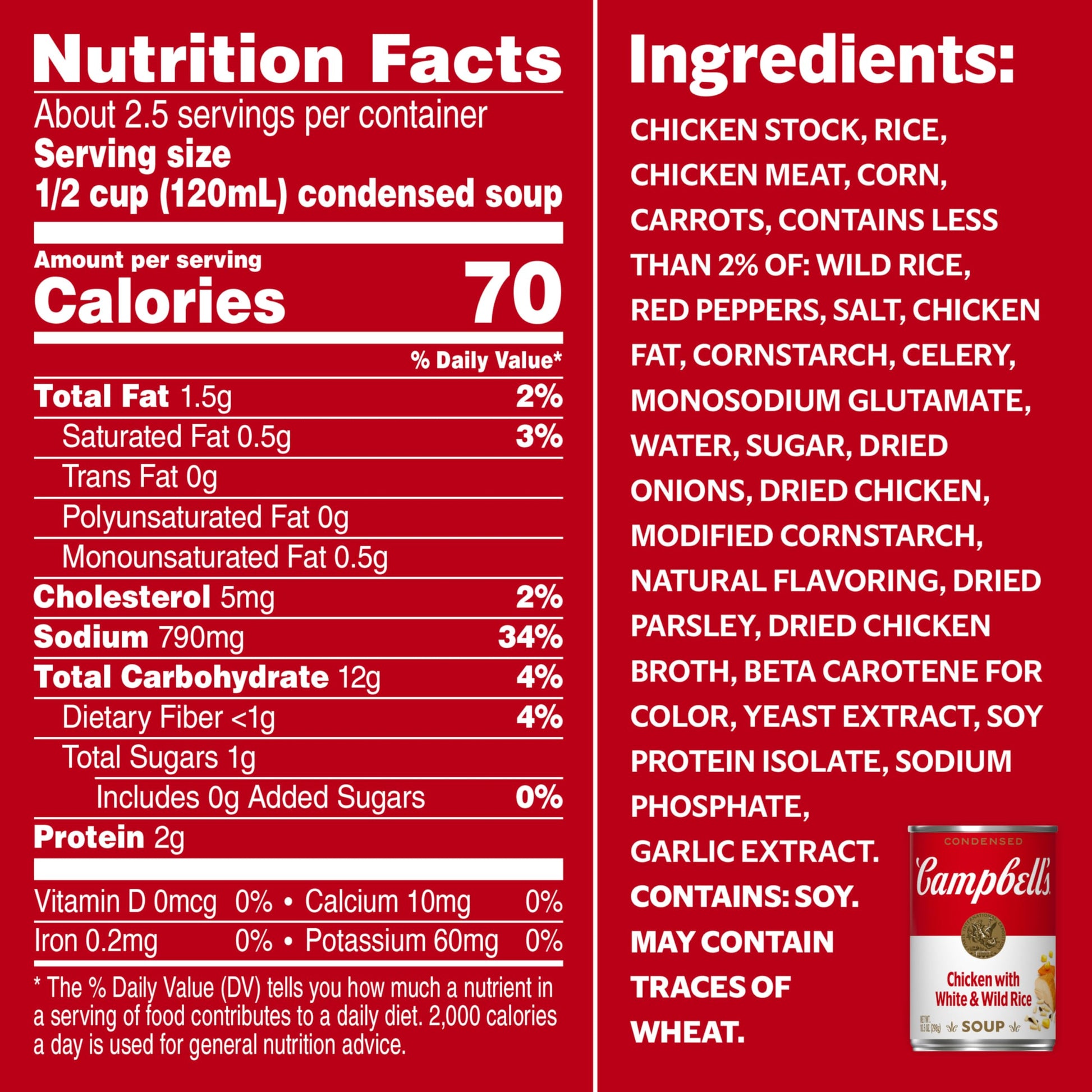 Q: What ingredients are in Campbell's Condensed Chicken with White & Wild Rice Soup?A: Campbell's Condensed Chicken with White & Wild Rice Soup contains high-quality ingredients such as white and wild rice, tender chicken raised without antibiotics, and a blend of veggies. This ensures a delicious and comforting meal.