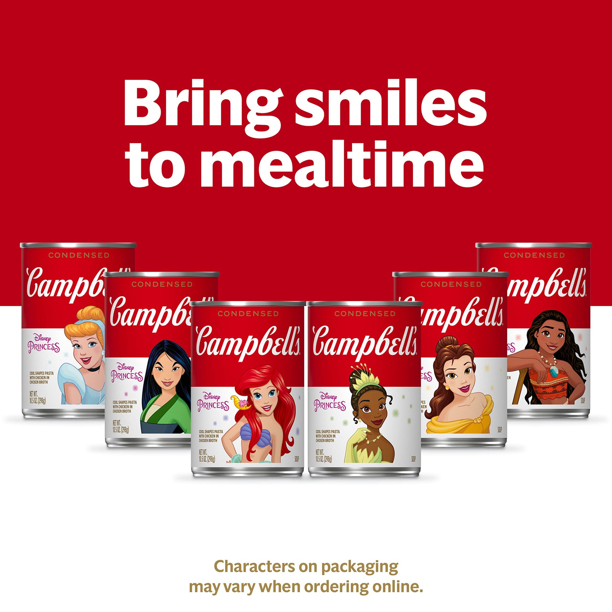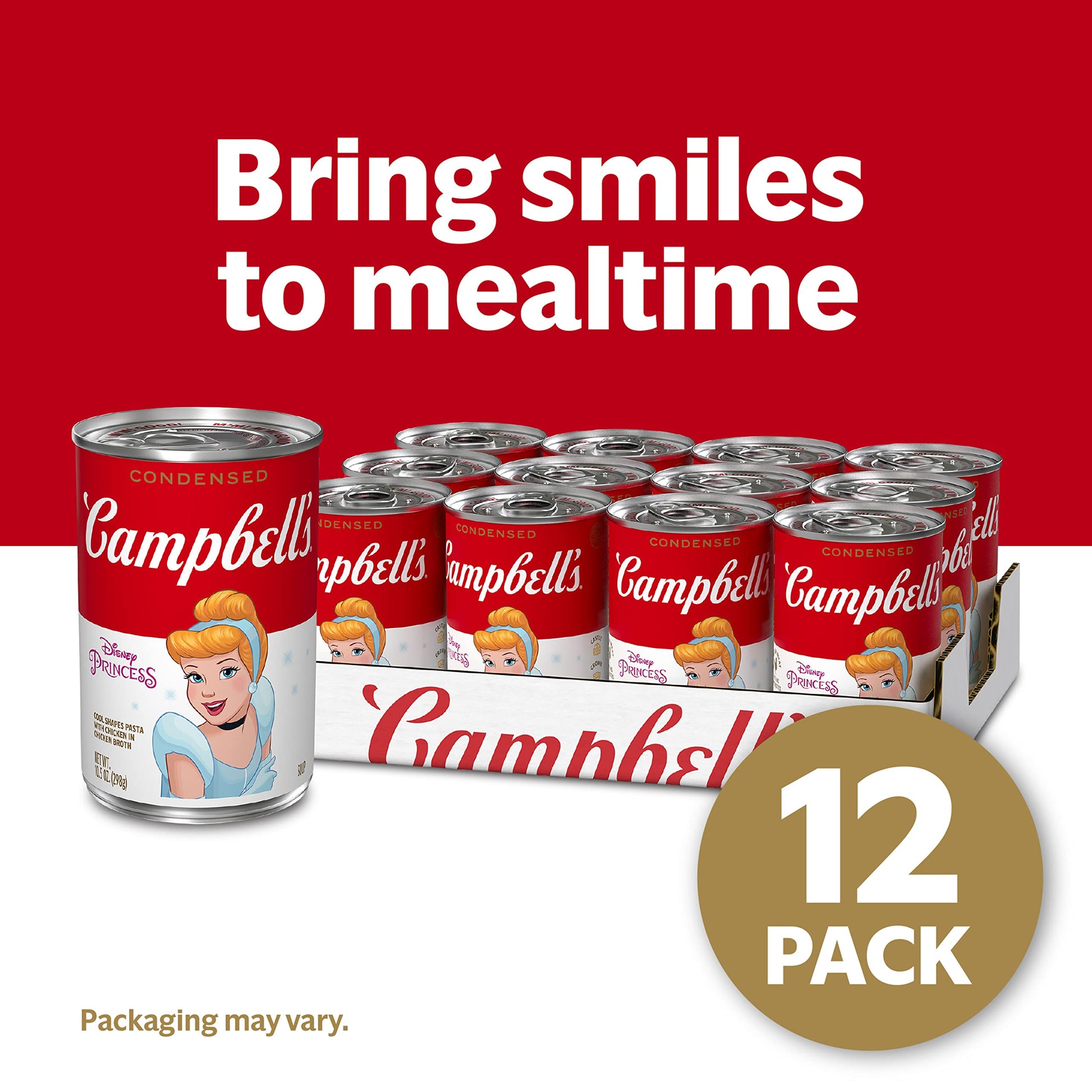 - Q: What is the packaging size of Campbell's Disney Princess Kids Soup? A: Campbell's Disney Princess Kids Soup is available in a convenient pack of 12, with each can containing 10.5 ounces of soup, making it easy to stock up for lunches or snacks.