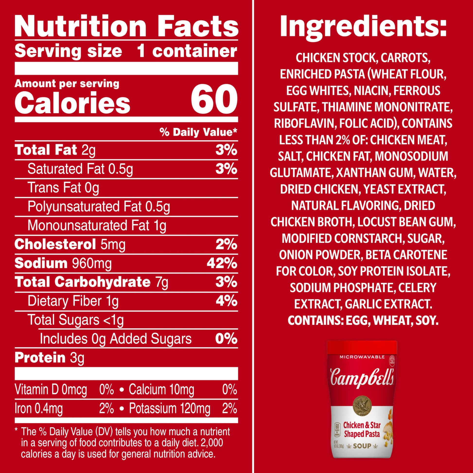 Sip delicious comfort at home or on the road with Campbell's Sipping Chicken Soup & Star Shaped Pasta. Every sip of this comforting chicken soup is crafted with the simple, delicious ingredients you grew up on. The soul-warming flavors of premium chicken broth, star shaped pasta and bites of tender chicken meat without antibiotics make this soup a delicious and nostalgic choice anytime, anywhere. This chicken soup is made without high fructose corn syrup for a snack you can feel good about. Just pop off the cap, remove the tab and microwave uncovered for one minute and 15 seconds. Let this easy to microwave soup sit for one minute, replace the cap and enjoy! Take this soup on the go for an easy, portable snack or part of a meal. The microwavable sipping soup cup makes it easy to hold and enjoy. Embark on your next adventure with Campbell's along for the ride. M'm M'm Good! In addition to Chicken and Star Shaped Pasta, Campbell's Sipping Soups are also available in Chicken and Mini Round Noodle, Creamy Tomato and more.