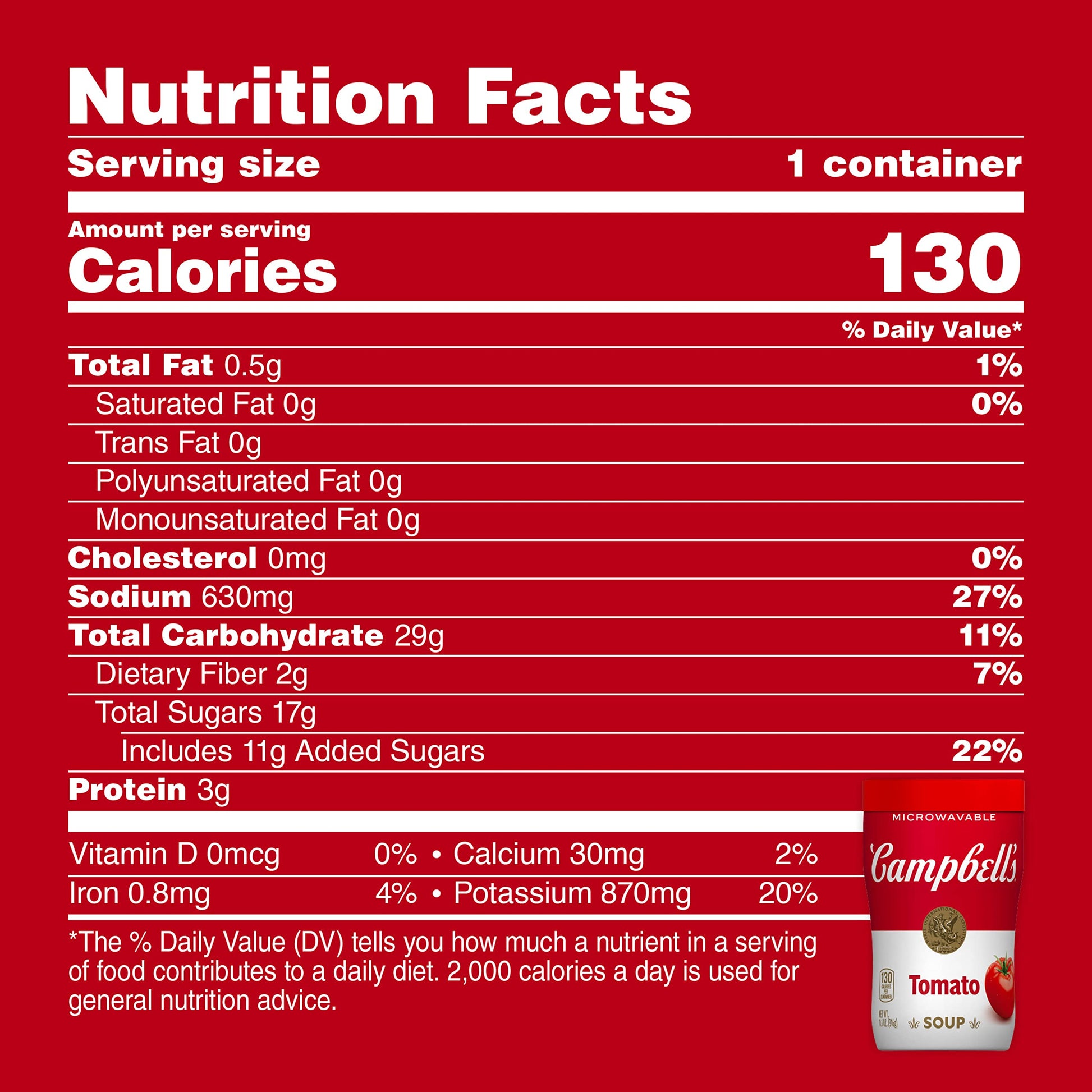DescriptionTake the classic flavors you know and love on the road with Campbell's Sipping Classic Tomato Soup. Every sip of this comforting tomato vegetable soup is crafted with the simple, delicious ingredients you grew up on. The tangy taste of tomato puree makes this soup a delicious and nostalgic choice anytime, anywhere. This vegetarian soup is made without high fructose corn syrup, artificial colors or added MSG for a snack you can feel good about. Just pop off the cap, remove the tab and microwave uncovered for one minute and 15 seconds. Let this easy to microwave soup sit for one minute, replace the cap and enjoy! Take this soup on the go for an easy, portable snack or part of a meal. The microwavable soup cup makes it easy to hold and enjoy. Embark on your next adventure with Campbell's along for the ride. M'm M'm Good! In addition to Classic Tomato Soup, Campbell's Sipping Soup is also available in Chicken and Mini Round Noodles, Creamy Tomato and more.