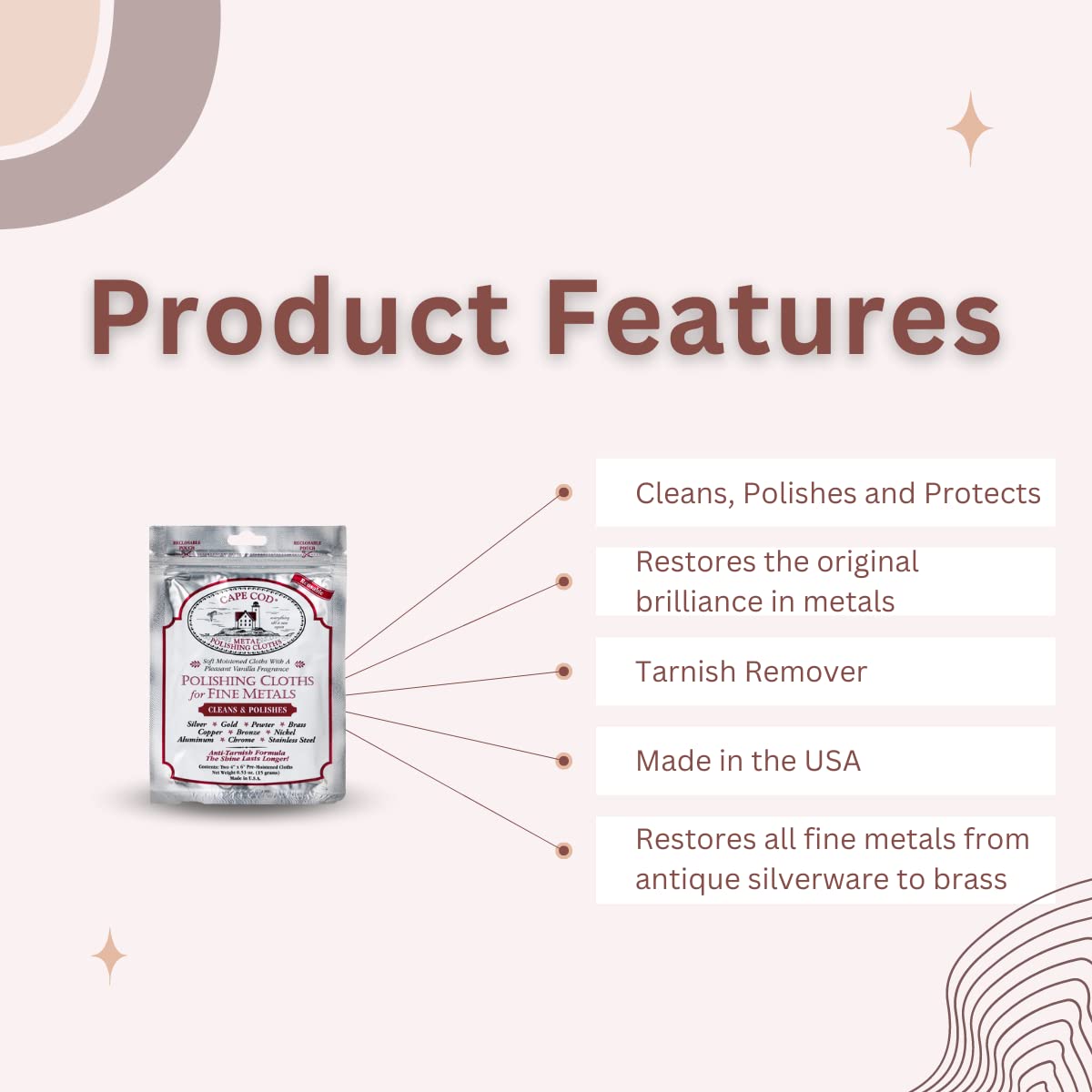 Q: How do Cape Cod Polishing Cloths work?A: Cape Cod Polishing Cloths are pre-moistened with a special solution that cleans, polishes, and protects various types of metals. Simply wipe the cloth on the surface to remove tarnish and restore brilliance, then buff off with a soft cloth for a shine.