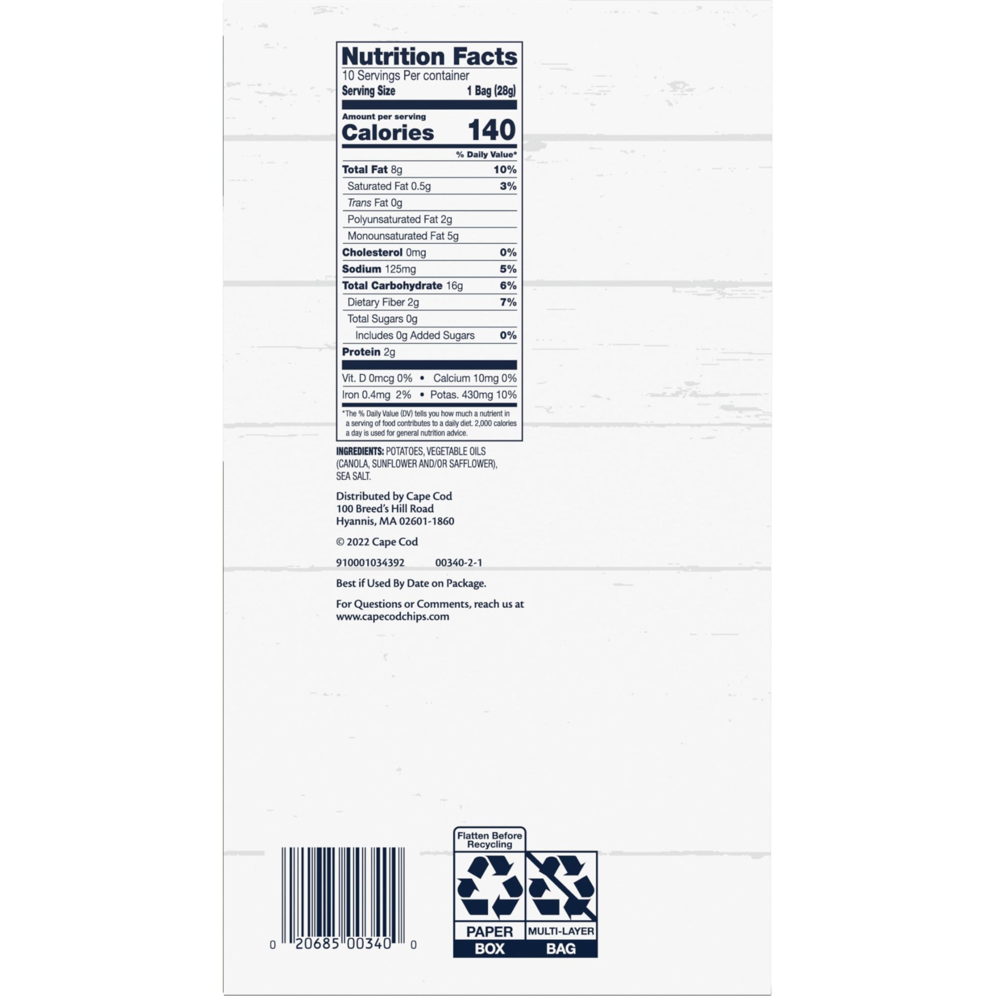 Enjoy 10 individual bags of Cape Cod Original Kettle Cooked Chips made with the pure taste of potato. And you can be sure there’s nothing else like them when it comes to their robust flavor and distinctive crunch. We take choice potatoes, slice them perfectly, add oil and sea salt, then kettle cook them one batch at a time in custom kettles. You can count on potato chips that are cooked precisely at the right temperature until they reach a golden-amber hue. You’ll see that unique shapes and folds mean one-of-a-kind chips, but they all share the same, wonderful Cape Cod crunch. With 10 single-serve snack bags in this multipack, you can enjoy them at home as a snack or a side, or on the go. Our potato chips are famous for their high quality and remarkable flavor, so be sure to try all the traditional and unique varieties. Every distinctive chip feels like an invitation to come savor everything that’s special about Cape Cod Kettle Chips.