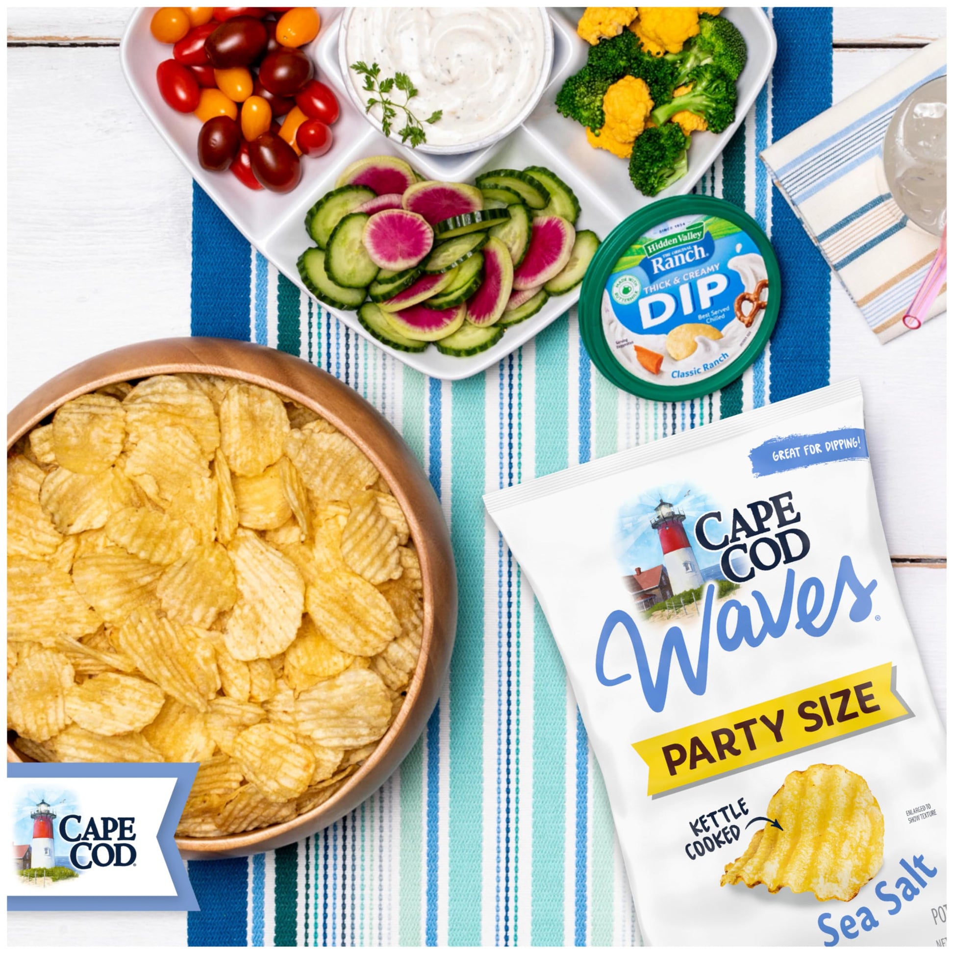 Q: What is the size of the party bag for these chips?A: The Cape Cod Wavy Cut Sea Salt Kettle Chips come in a 13-ounce party size bag, which is ideal for sharing at parties, picnics, or just enjoying as a snack.