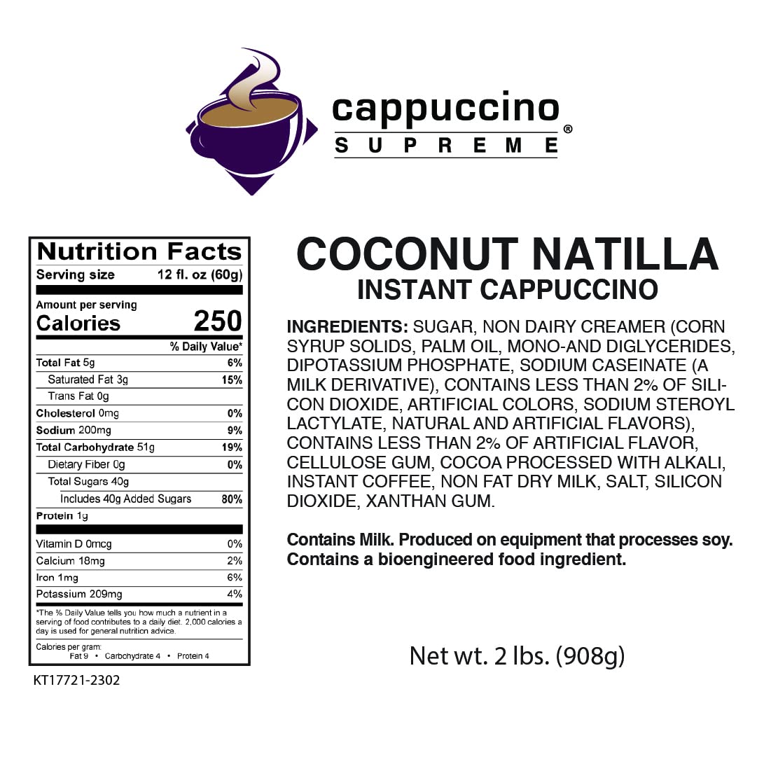 Our Coconut Natilla Cappuccino Was Inspired By The Colombian Custard Popular At Christmas Time. This Cappuccino Tastes Rich And Decadent, With Flavors Of Coconut Custard And A Dash Of Cinnamon, Blended With Our Deep Rich Dark Roast Coffee. Each 2 Lb. Bag Of Coconut Natilla Instant Cappuccino Mix Makes About 22 - 8 Oz Servings. Made For Use In Instant Cappuccino Machines (I.E., Bunn, Cecilware), But Perfect For Home Use, Too! Just Add Hot Water And Stir. Made In Usa. Kosher And Gluten Free