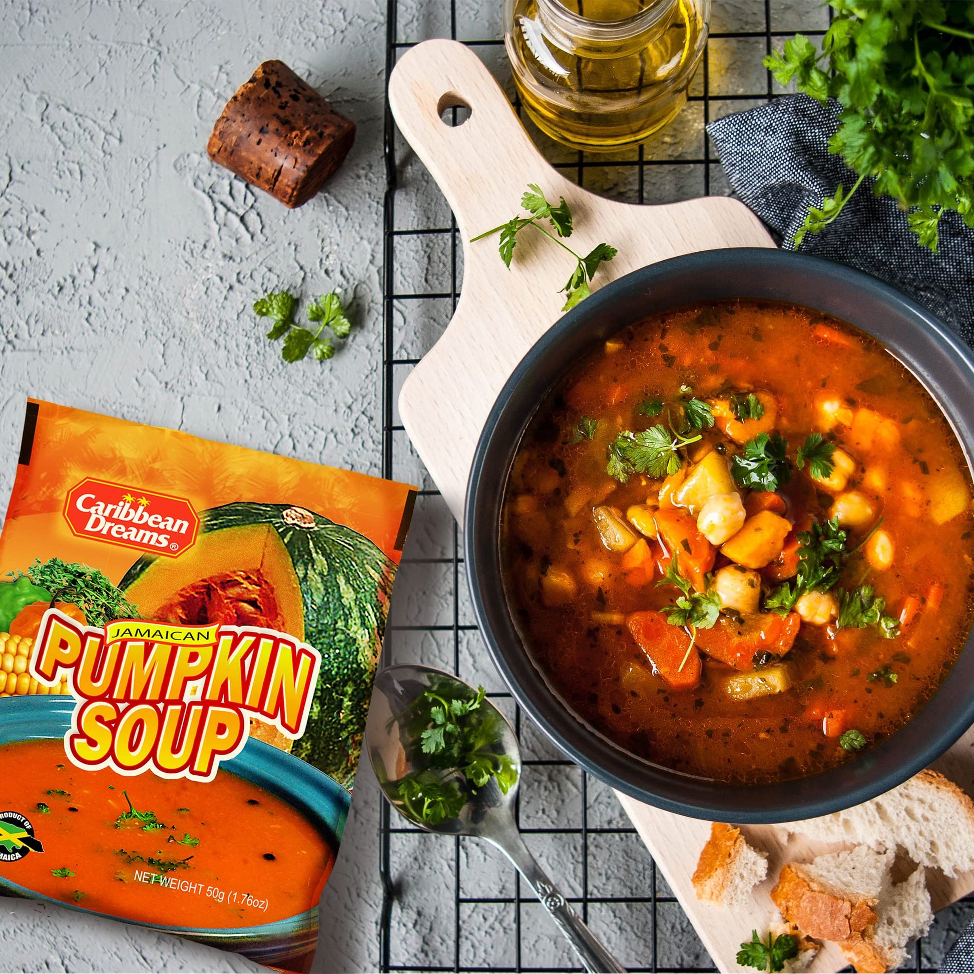 - Q: How do I prepare Caribbean Dreams Jamaican Pumpkin Soup? A: To prepare Caribbean Dreams Jamaican Pumpkin Soup, simply follow the instructions on the packaging. Typically, you need to mix the soup powder with water and heat it until it's warm. You can customize it by adding your choice of proteins or vegetables.