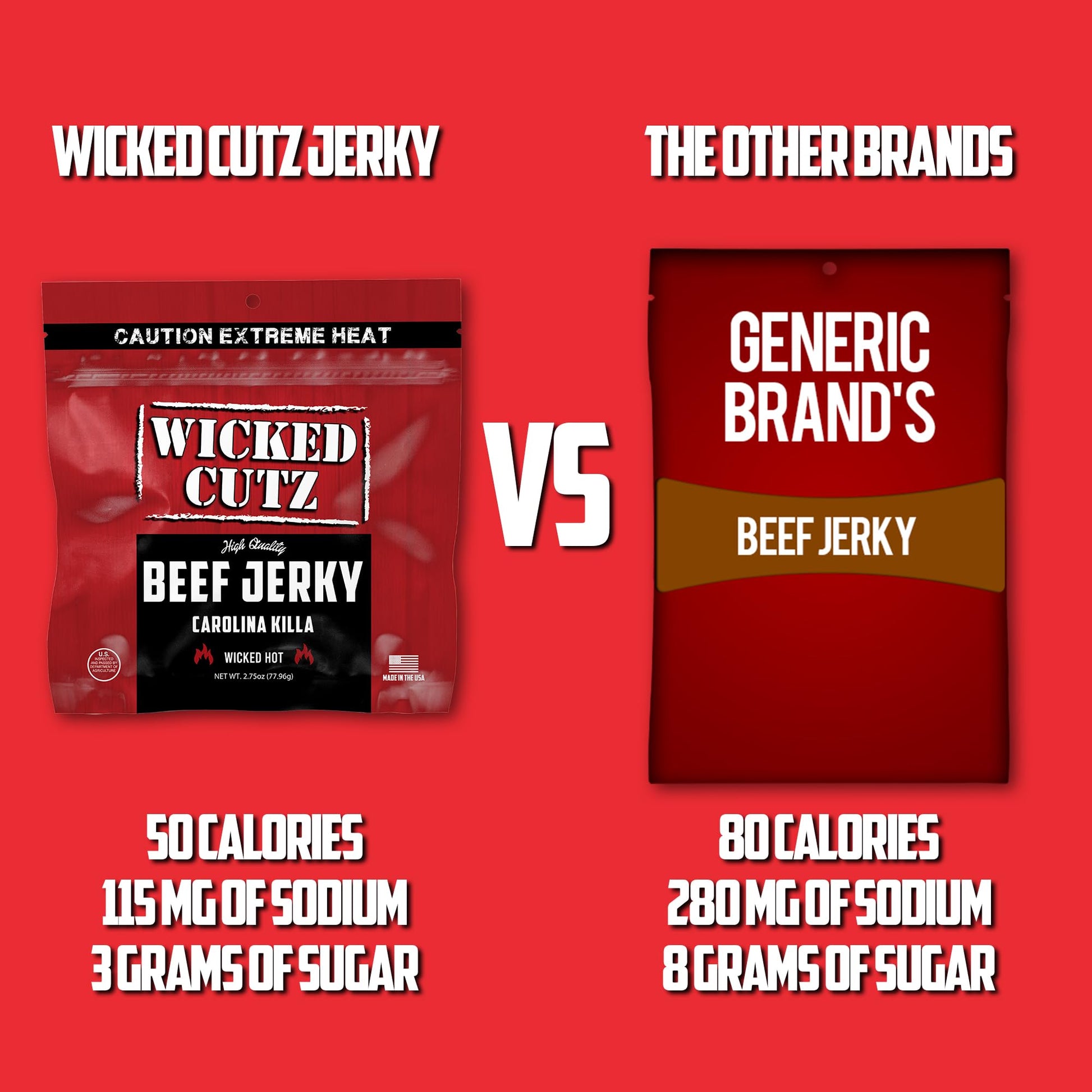 • Q: What makes Wicked Cutz Beef Jerky a healthy snack option? A: Wicked Cutz Beef Jerky is made from high-quality, lean cuts of beef, providing 27g of protein per bag with only 50 calories and 3g of carbohydrates per serving. It contains no artificial preservatives, MSG, or nitrates, making it a great choice for those following keto, paleo, or low-carb diets.