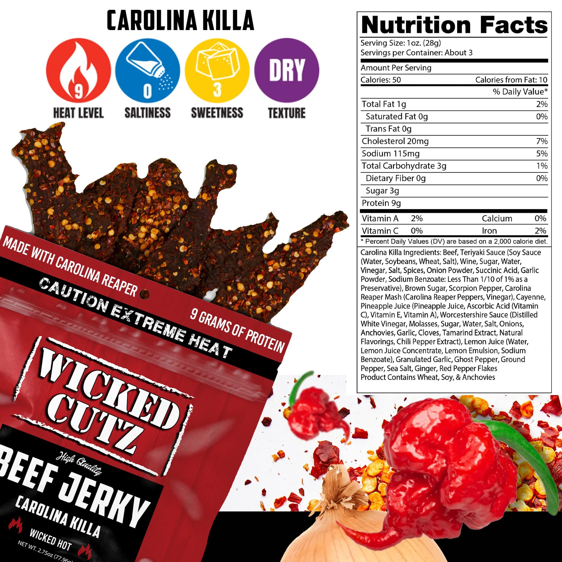 • Q: How spicy is the Carolina Killa Beef Jerky? A: The Carolina Killa Beef Jerky is designed for heat lovers, combining the three hottest peppers in the world: Carolina Reapers, Scorpion, and Ghost Peppers. It delivers a satisfying spice level without the guilt associated with processed snacks.