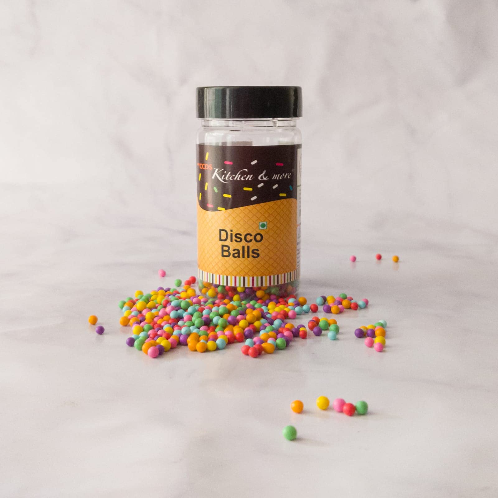 Q: What is the packaging like for CCDS Edible Disco Balls?A: The sprinkles come in a handy storage jar, making it easy to dispense and keep them fresh when not in use.