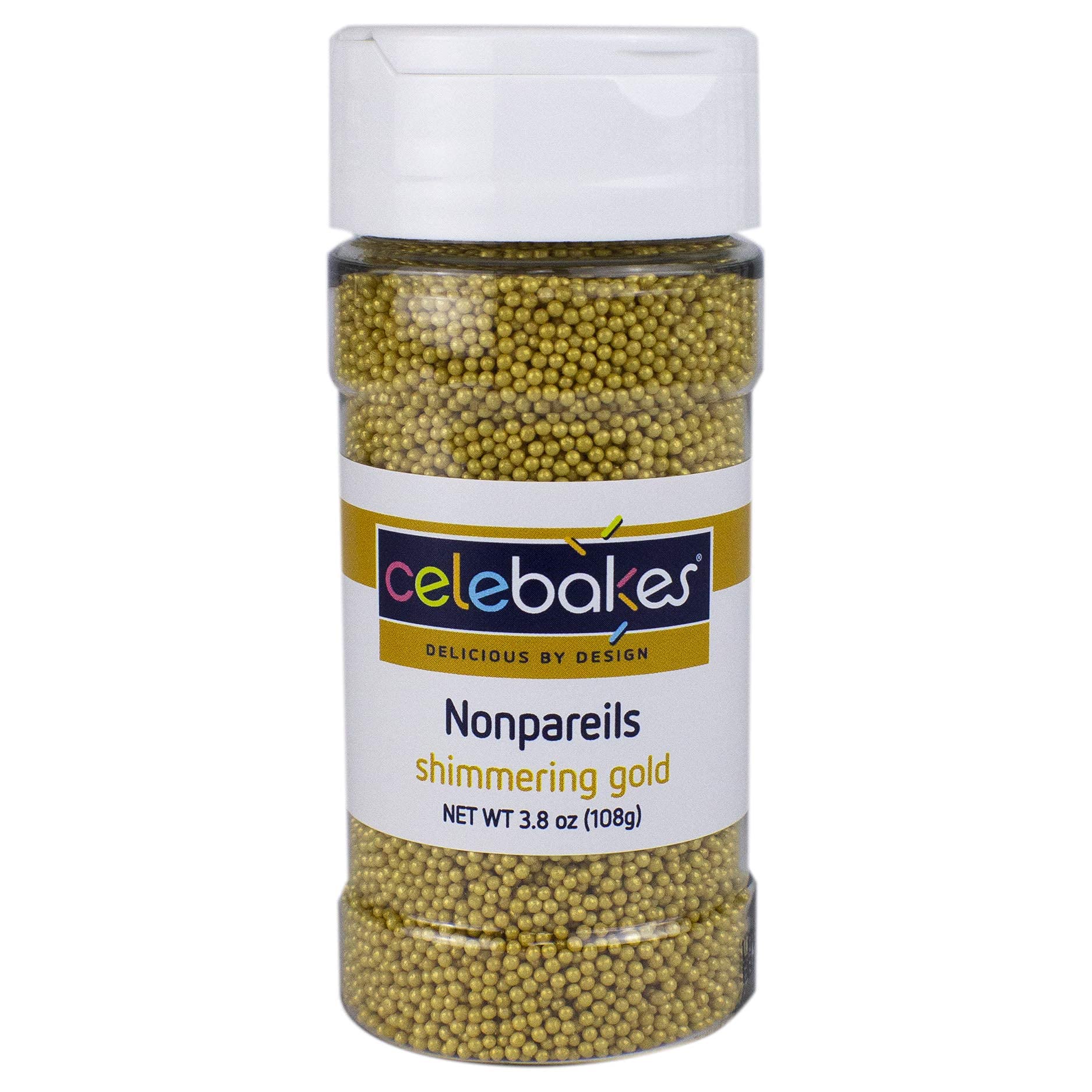 Q: How much product is included in a pack of Celebakes Nonpareils?A: Each pack of Celebakes Shimmering Gold Nonpareils contains 3.8 ounces, providing you with ample sprinkles for multiple decorating projects.