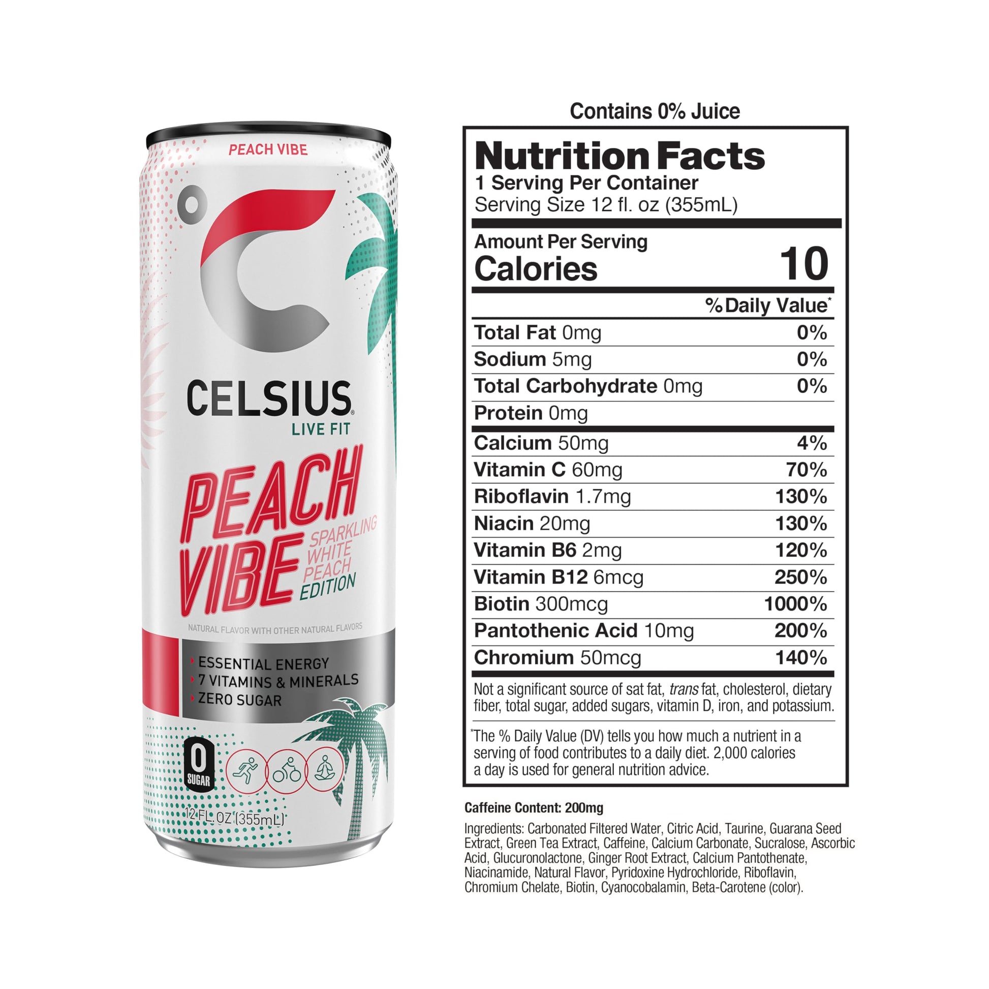 - Q: Where can I buy CELSIUS Sparkling Peach Vibe? A: CELSIUS Sparkling Peach Vibe is available in 12 oz. slim cans sold in a convenient 12-pack, and it can be purchased at various retailers, including grocery stores and online marketplaces.