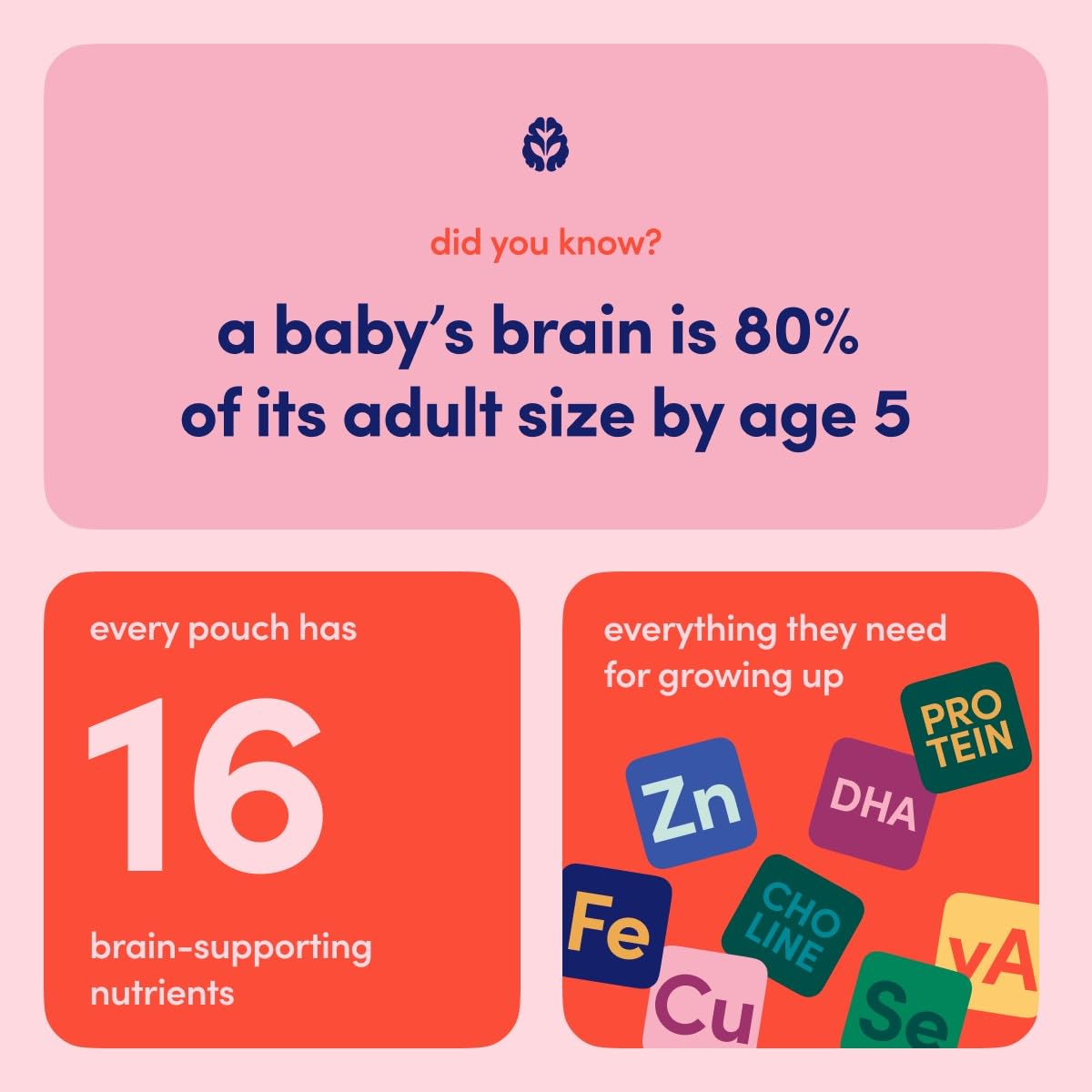 Q: How many nutrients are included in Cerebelly Baby Food Pouches?A: Each pouch contains 17 brain-supporting nutrients, including essential vitamins like Vitamin A and Vitamin E, which aid in emotional and cognitive development.