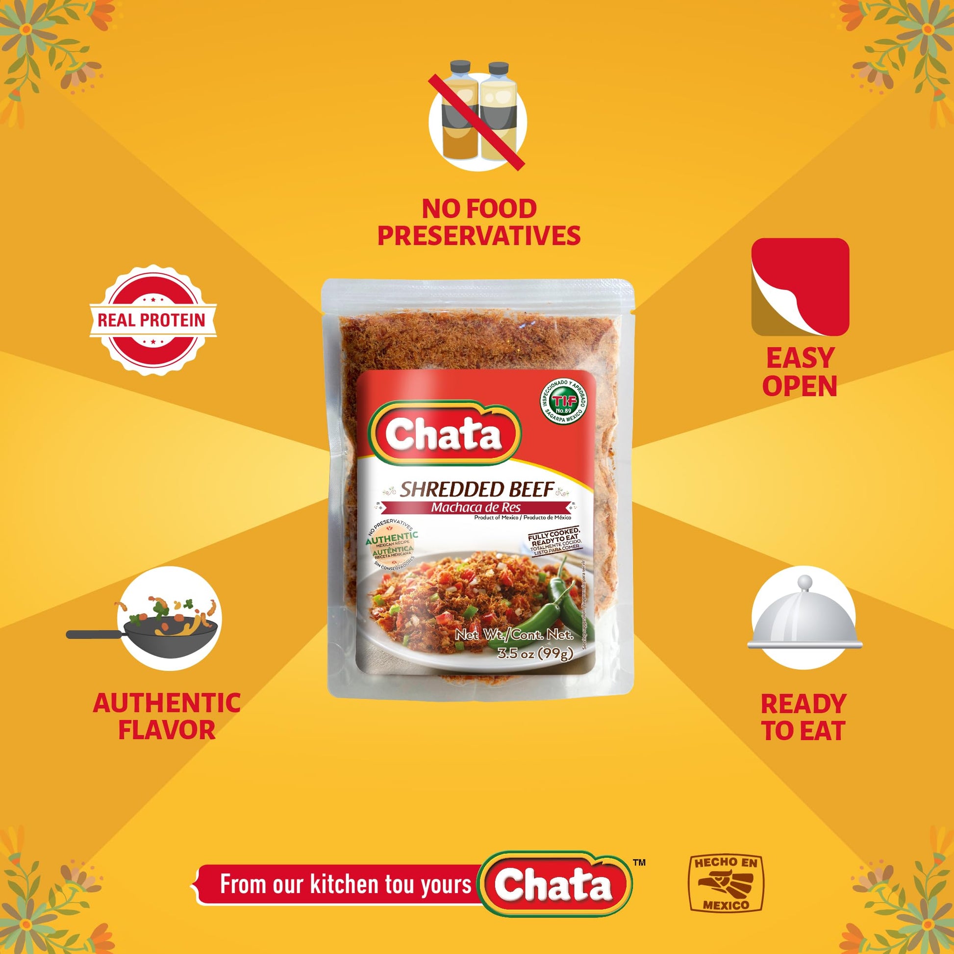 Machaca Is A Traditional Dish From Northwest Of Mexico, Made Of Shredded Dried Beef And Salt. Machaca Can Be Cooked In Many Delicious Ways, With Eggs, Vegetables, To The Mexican Style , In Broths Or The Traditional Burritos. Chata Offers Machaca Made With 100% Beef, A Very Traditional Taste, Texture And Brown Color. It Is Prepared With A Homemade Touch Which Sets Chata Brand Apart, And It Is Prepared Under The Sqf (Safe Quality Food) System.