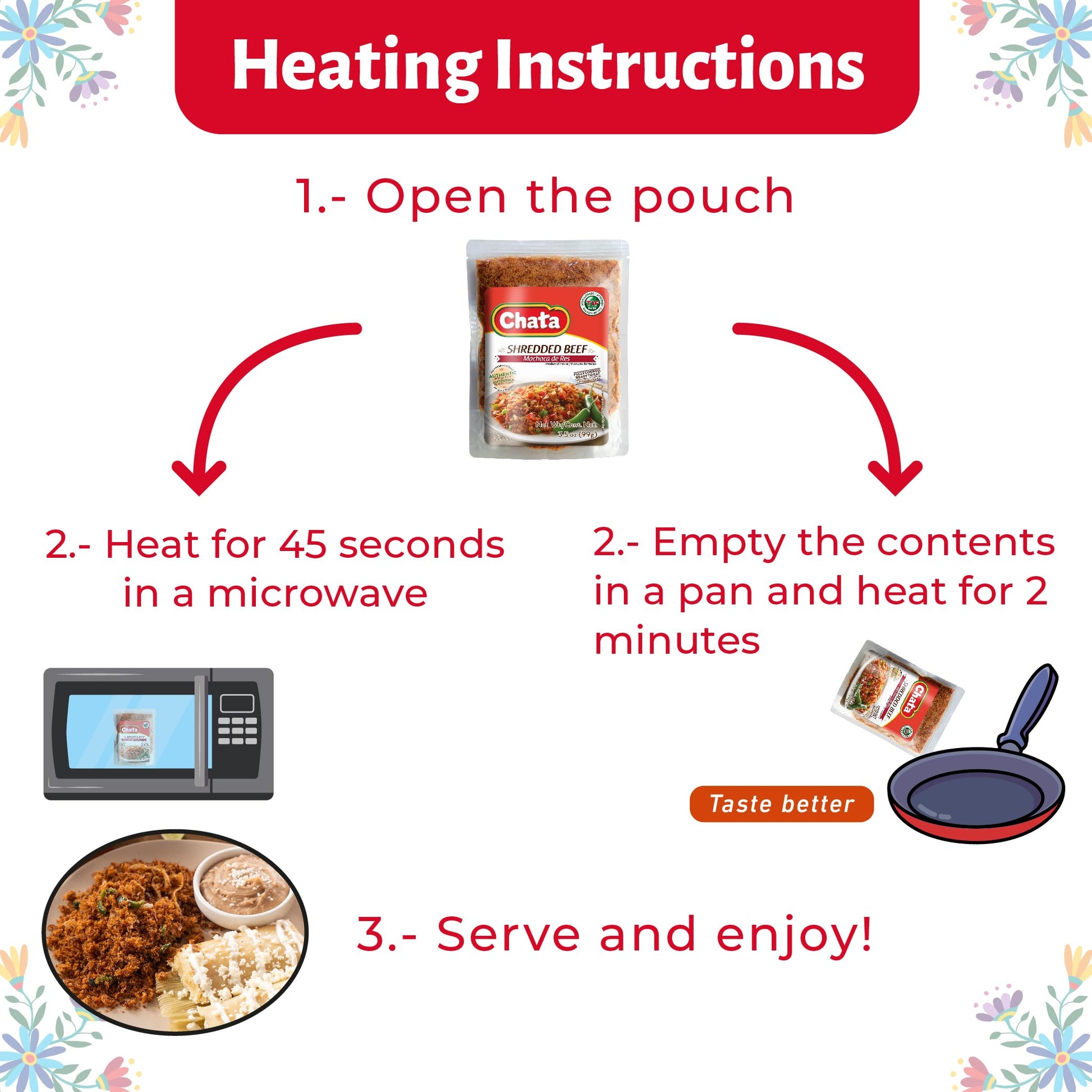 Q: What is Chata Machaca de Res and how is it prepared?A: Chata Machaca de Res is a savory shredded beef dish that is ready to eat. To prepare, simply heat the pouch and serve. It is designed for convenience, making it ideal for quick meals.