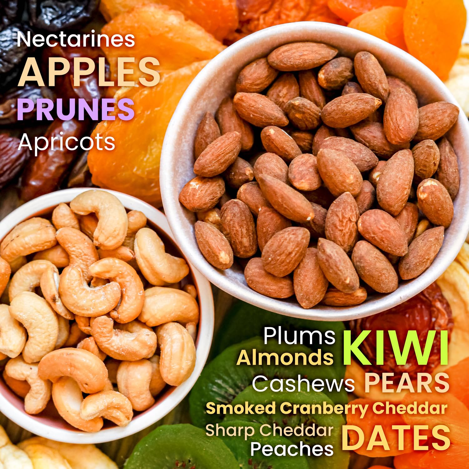 - Q: What items are included in the Cheese and Snack Charcuterie Board? A: The Cheese and Snack Charcuterie Board includes a delightful assortment of 6 oz of Sharp Cheddar Cheese, 4 oz of Smoked Cranberry Cheddar, and a variety of dried fruits and nuts such as almonds, cashews, apricots, kiwis, apples, plums, peaches, pears, prunes, and dates, totaling over 38 oz of delicious snacks.