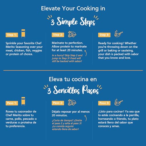 - Q: How should I use Chef Merito Carne Asada Meat Seasoning? A: To use Chef Merito Carne Asada Meat Seasoning, sprinkle 1/2 teaspoon on each side of a 6-ounce steak and let it marinate for at least 20 minutes. For optimal flavor, marinate overnight. Consider pairing it with Chef Merito Jugo de Limon for added tenderness and flavor.