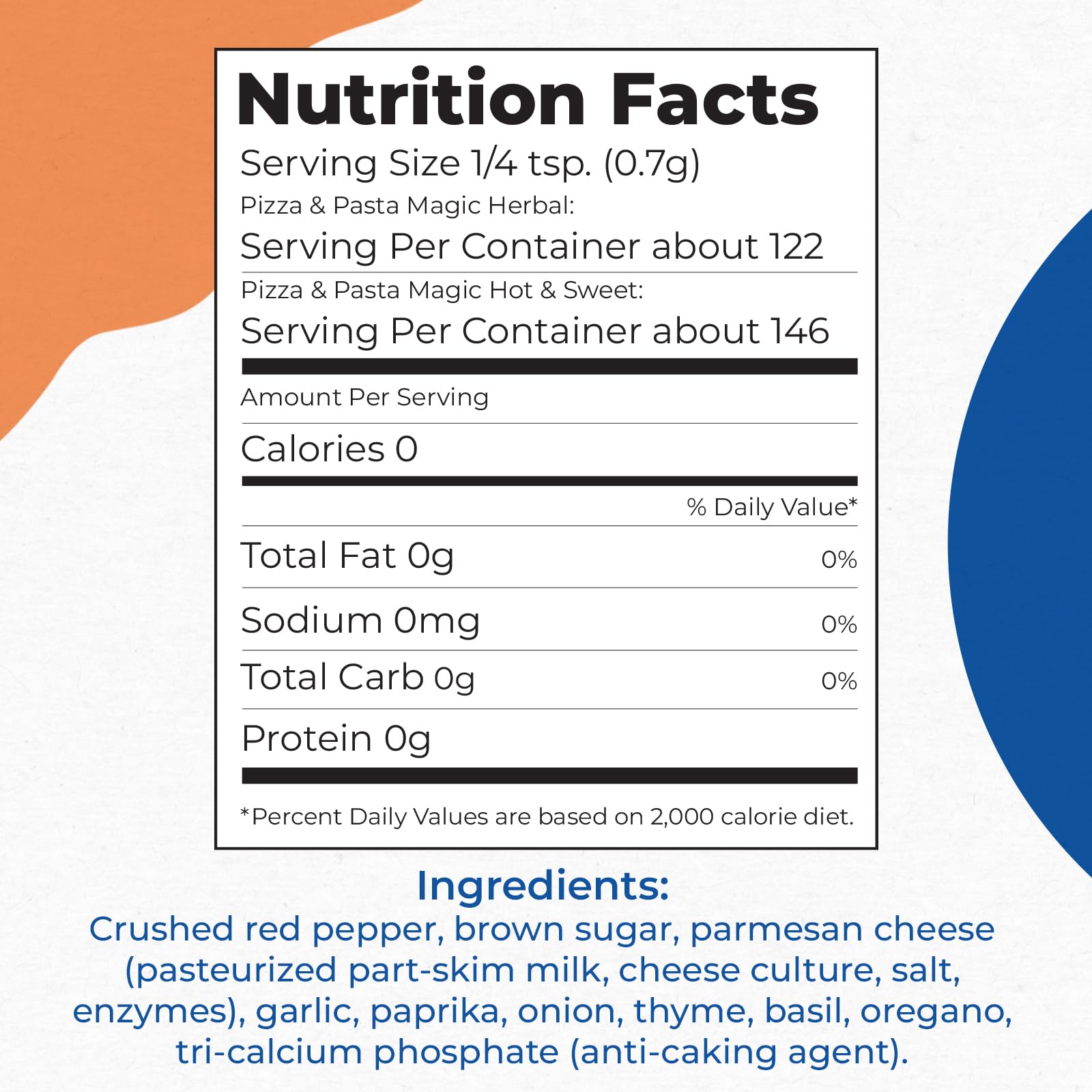 - Q: What are the main ingredients in Chef Paul Magic Seasonings Blends Hot and Sweet Pizza and Pasta Magic? A: The main ingredients include real Parmesan cheese, crushed red pepper, garlic, onion, thyme, oregano, and a selection of hand-picked spices. This blend is designed to enhance the flavor of a variety of dishes.