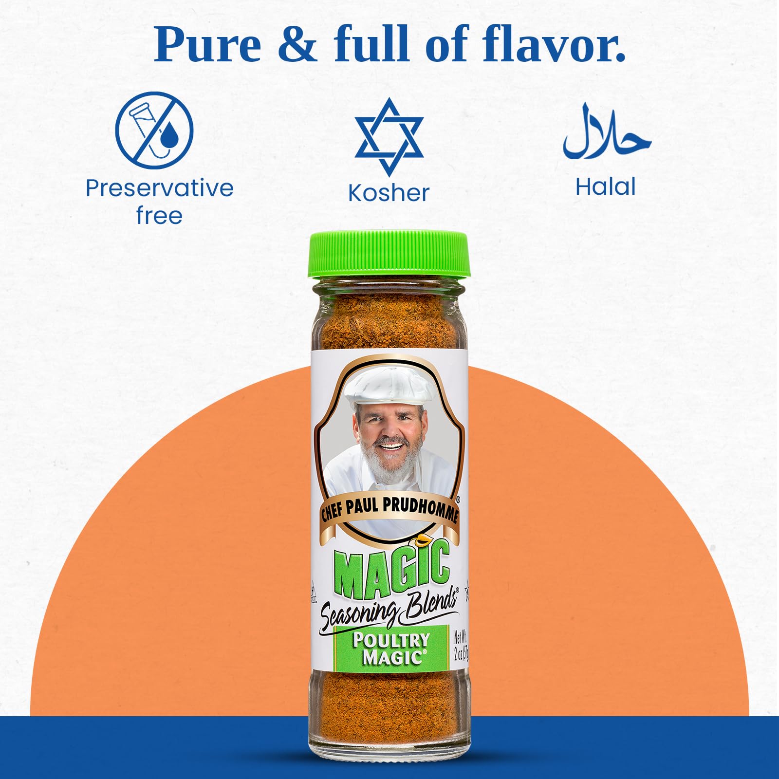 - Q: What is Chef Paul Magic Seasonings Blends Poultry Magic Seasoning made of? A: Chef Paul Magic Seasonings Blends Poultry Magic Seasoning is crafted from a blend of spices including salt, garlic, onion, paprika, and an anti-caking agent. It is free from MSG, preservatives, and gluten, ensuring a clean and natural flavor profile.