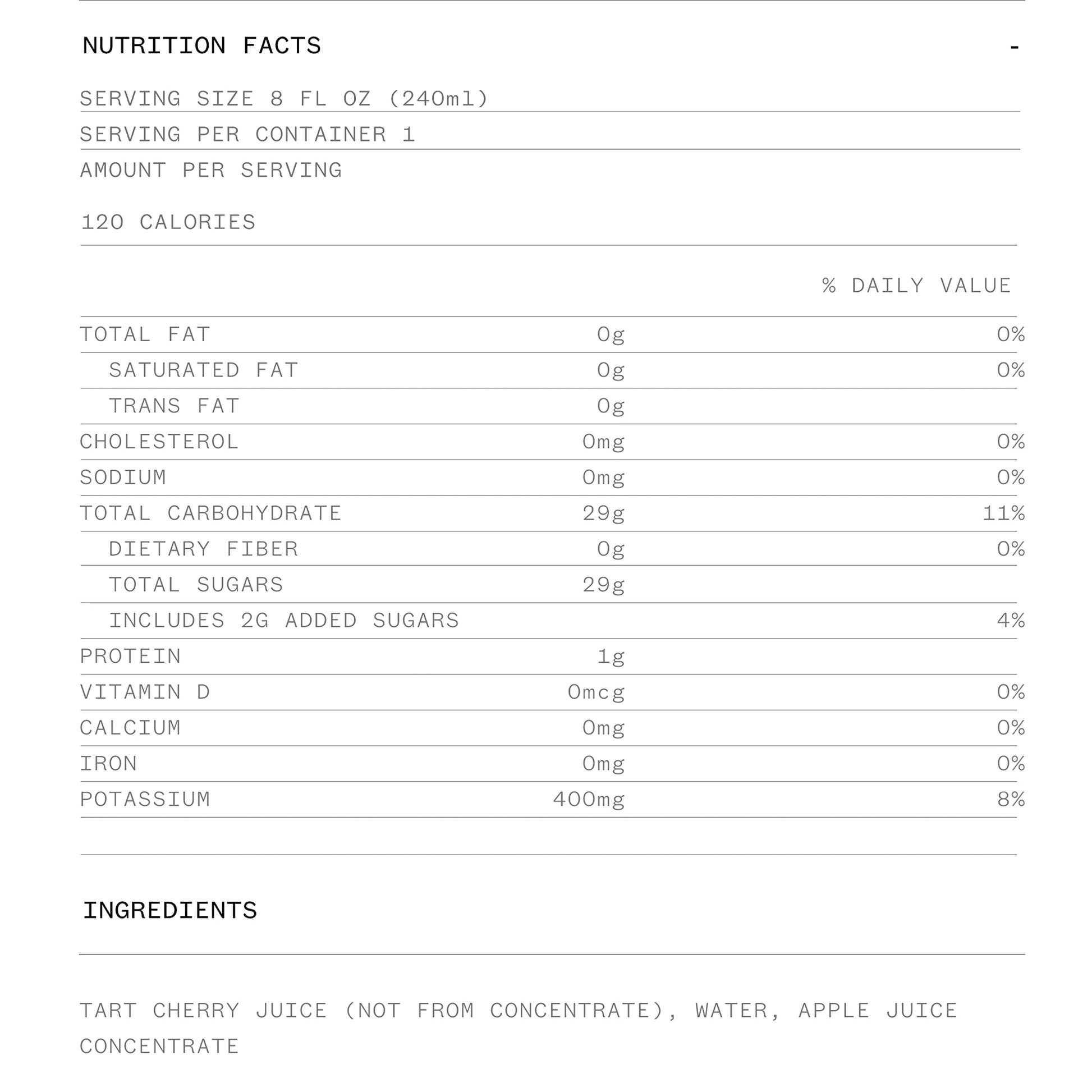 Q: What makes Cheribundi Tart Cherry Juice different from other fruit juices?A: Cheribundi Tart Cherry Juice is made from fresh-pressed tart cherries, not from concentrate, and is lightly sweetened with apple juice. It contains no preservatives or artificial sweeteners, ensuring a pure and natural product.