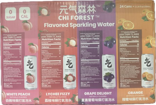 Q: What flavors are included in the CHI Forest Flavored Sparkling Water Variety Pack?A: The CHI Forest Flavored Sparkling Water Variety Pack includes four delicious flavors: White Peach, Lychee Fizzy, Grape Delight, and Orange.