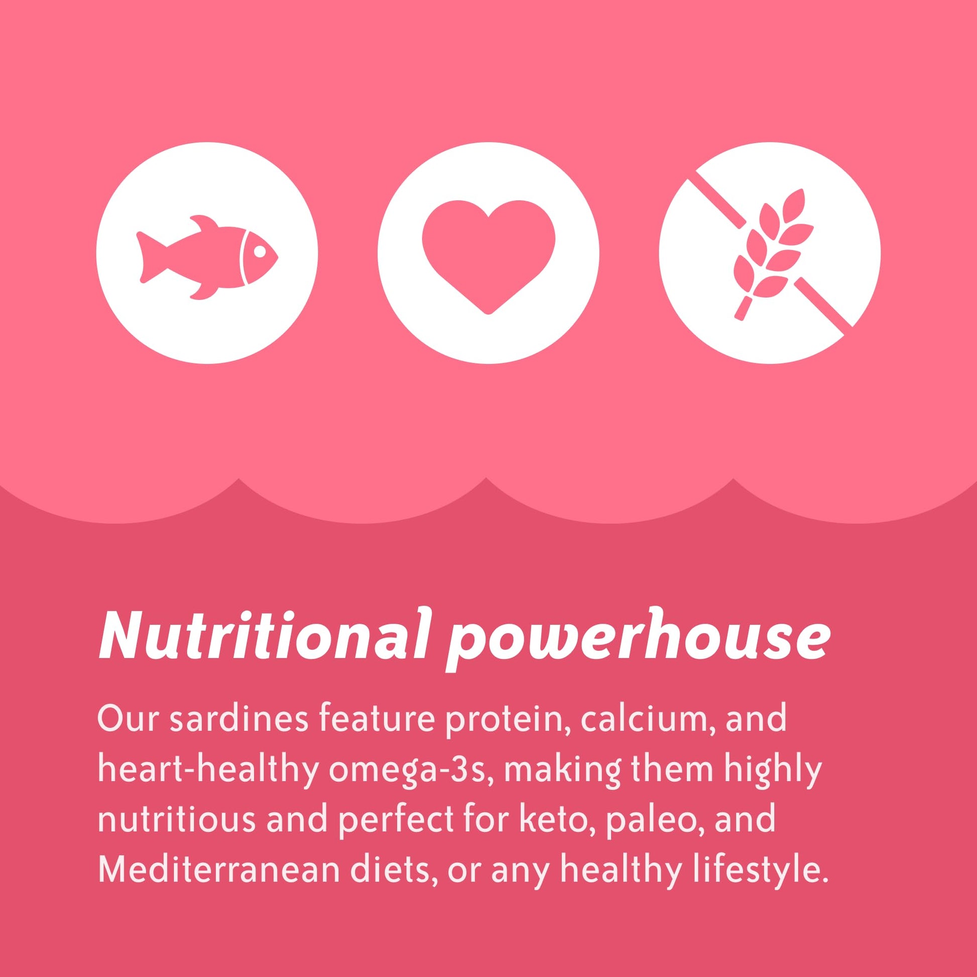 NUTRITIONAL POWERHOUSE: Our sardines feature protein, calcium, and heart-healthy omega-3s, making them an ideal addition to keto, paleo, and Mediterranean diets, or any healthy lifestyle. They are also gluten-free with no preservatives.