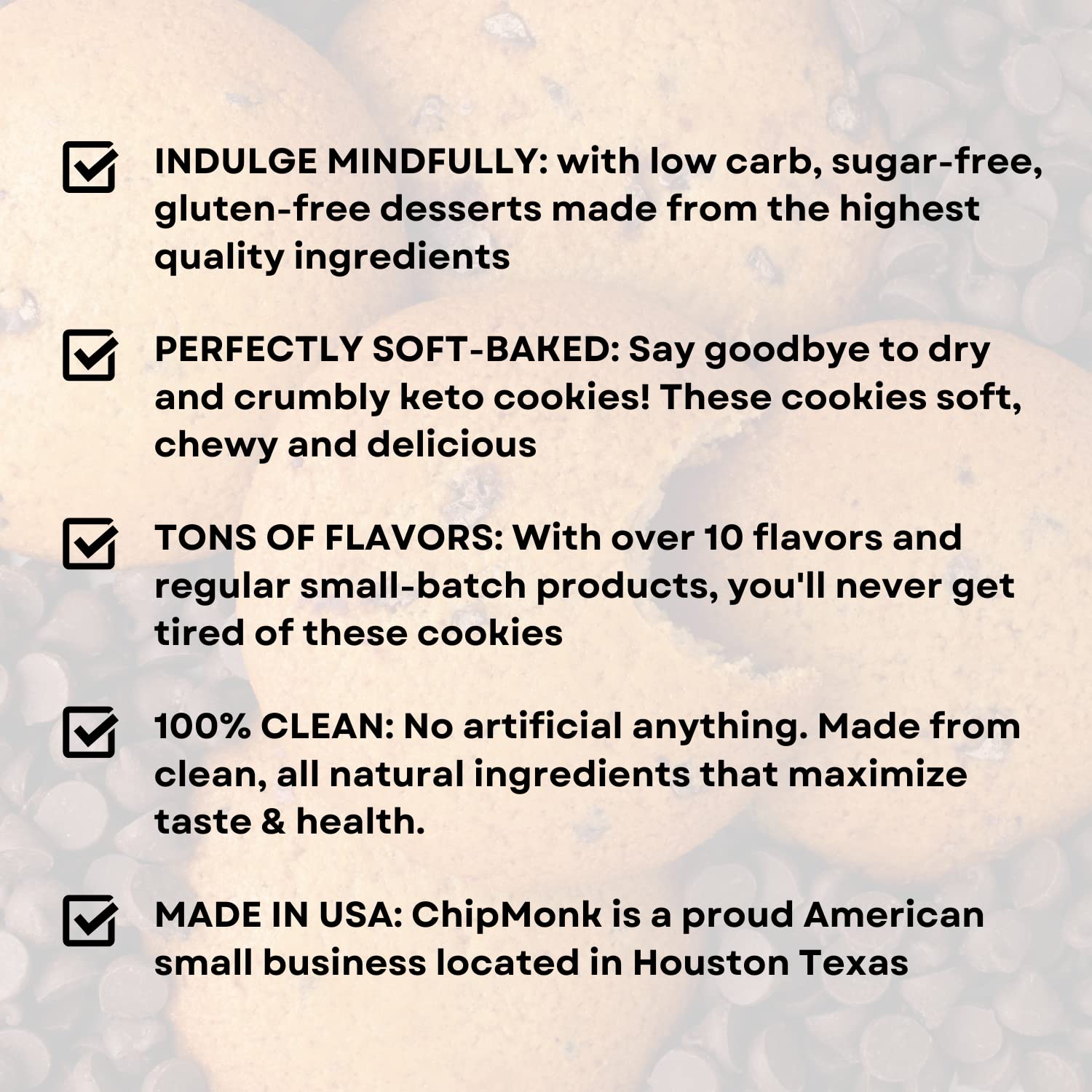 Introducing Chipmonk Keto Cookies Now Available In A Variety Of Delicious Low Carb, High Protein Options.These Keto Cookies Are The Perfect Option For Any Ketogenic Dieters, Diabetics, Or Individuals With Gluten Intolerances.Keto Diet Friendly And Diabetic Approved Because These Keto Cookies Are Low In Sugar And Carbs But Rich In Protein, Healthy Fats, And Nutrients, This Snack Is A Smart Option For Anyone Following The Keto Diet Or Anyone With Glucose Sensitivities. These Keto-Friendly Cookies Are Sweetened With Monk Fruit And Allulose, Which Are All-Natural, Zero Carb Sweeteners. No Blood Sugar Spikes Or Heavy Crashes; These Cookies Provide Sustainable Energy.Gluten-Free High Protein Cookieswe Chose A Healthy, Low Carb, Nut Option To Bring You A Food Packed With Protein. These Soft And Chewy Cookies Are Grain-Free And Gluten-Free And Are Made From Almond Flour Which Creates A Low Carb But High Protein Snack. Conveniently Packaged Snacksthese Keto Cookies Come In A Convenient Package That Makes It Easy To Take This Smart Choice With You Throughout Your Busy Day. Whether You Are Following The Keto Diet, Or You Have To Monitor Your Carbohydrate And Sugar Intake, These Guilt Free Snacks Are Perfect To Carry Around With You Wherever You Go.Guilt Freeeach Individual Cookie Has Just 170-200 Calories, 14-16G Of Fat, 4-7G Of Protein, 2-4G Of Fiber And Just 1-4G Net Carbs. Flavors Include: Chocolate Chip Pecan, Peanut Butter, Cinnamon Snickerdoodle, And White Chocolate Macadamia, And Birthday Cake.100% Customer Satisfactionif For Any Reason You Are Dissatisfied With Your Purchase, Please Contact Us And We Will Be Happy To Refund Or Exchange Your Product With No Questions Asked.Order Your Chipmonk Keto Cookies Today, While Supplies Last!