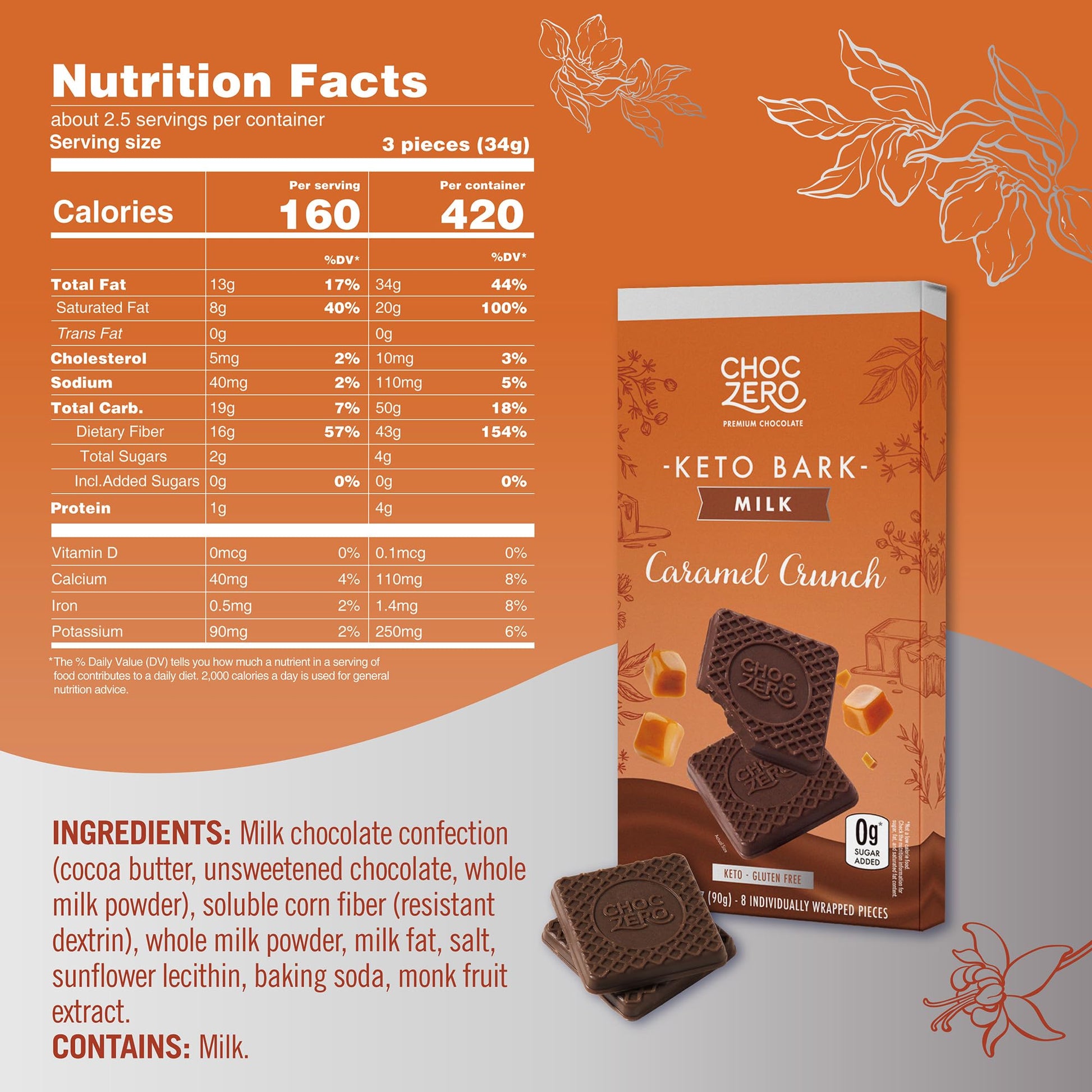 This Listing Is For 2 Bags Of Choczero'S Caramel Crunch Keto Bark Milk Chocolate Bars. Each Bag Contains Six 6Oz Individually Wrapped Candy Bars--Perfect For Snacking Or Dessert! They'Re No Sugar Added, 2G Net Carbs Each, And Have Chunks Of Salted Caramel Enrobed In A Creamy Low Carb Milk Chocolate. They'Re Sweetened With Monk Fruit And No Artificial Sweeteners Or Sugar Alcohols.